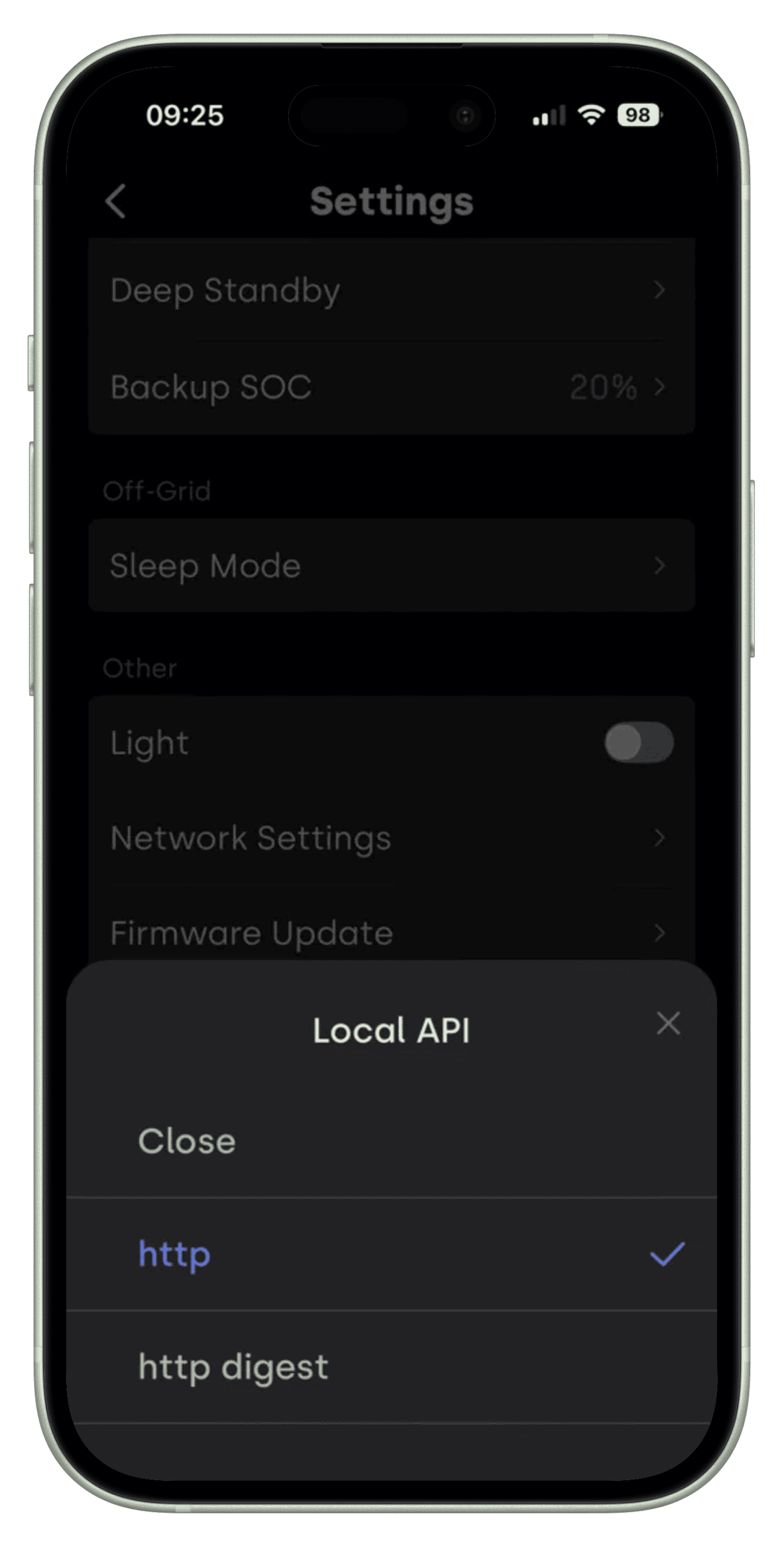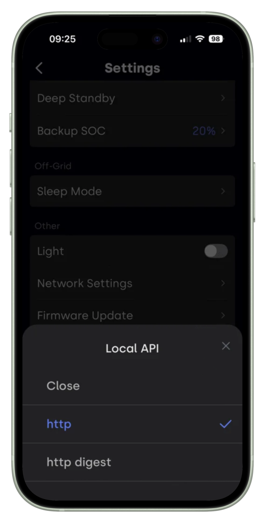 curl -s -g -X POST -H "Content-Type: application/json" "http://192.168.1.75:8080/rpc/Indevolt.SetData?config={\"f\":16,\"t\":47005,\"v\":[4]}"