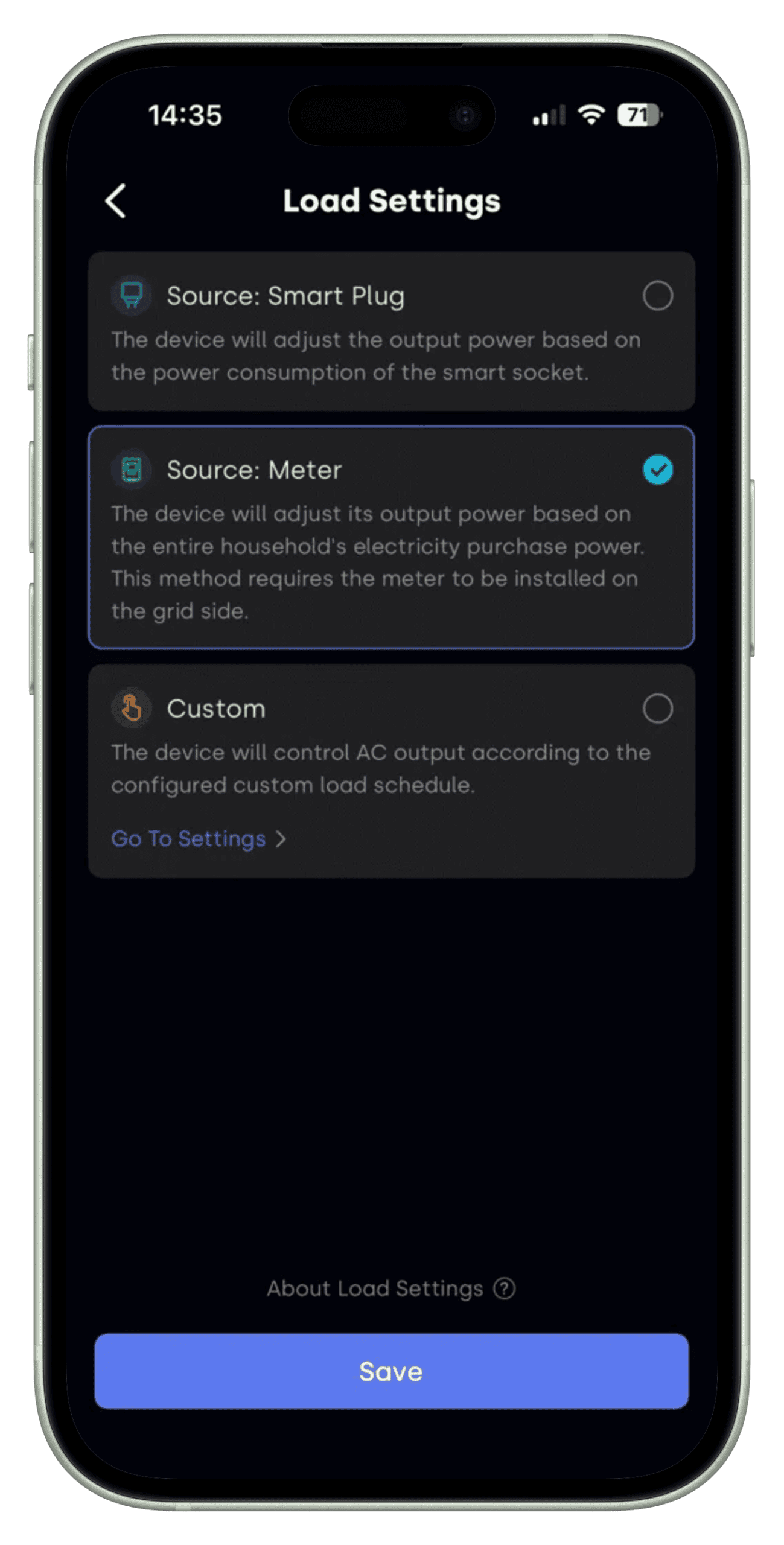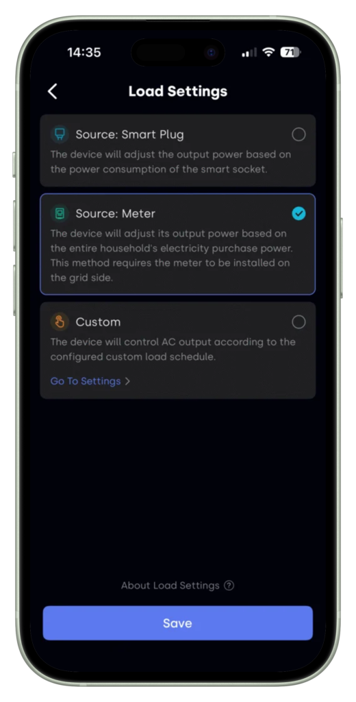 Naast de NOM modus kun je ook een smartstekker als bron selecteren(zie foto hierboven voor de 3 mogelijkheden). De batterij zal dan het verbruik van het apparaat dat op de smartstekker is aangesloten automatisch compenseren. Daarnaast kun je hier ontlaadwaarden instellen op basis van een vast schema, echter alleen op uren en niet op dagen van de week.