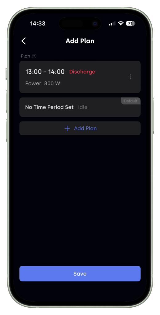 - Koppelen met de app – Download de Indevolt app, verbind de batterij via WiFi en doorloop de configuratie. Dit wijst zich redelijk vanzelf. Hier kun je ook handmatig laad- en ontlaadinstellingen beheren (ook via een schema). En voor een specifieke modus kiezen, en zie je meteen hoeveel energie wordt opgeslagen via pv of via ac en hoeveel het huis verbruikt.