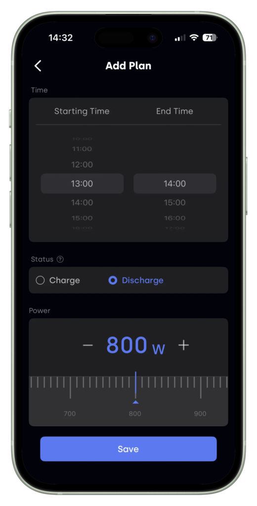- ‘Laad/ontlaad schema’: In deze stand kun je zelf vaste laad- en ontlaadtijden instellen over de dag, inclusief het gewenste vermogen per tijdsblok.