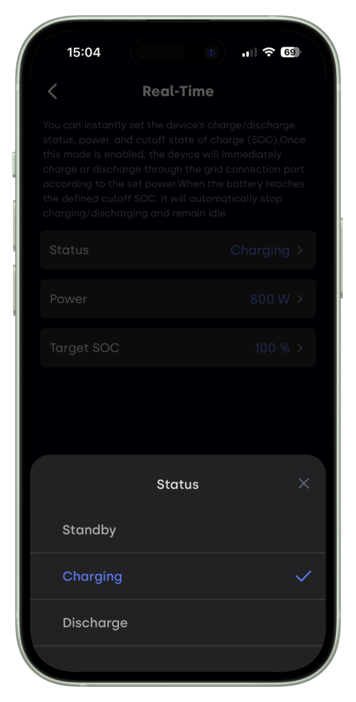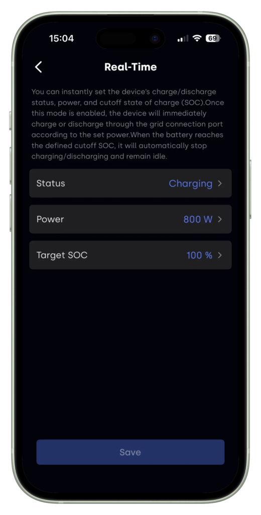 In de realtime-modus kun je de batterij direct laten laden of ontladen, zonder gebruik te maken van schema’s of externe stuurapparaten zoals smartstekkers of de P1-meter. Daarnaast kun je via een state of charge (SoC)-instelling bepalen tot welk laad- of ontlaadniveau de batterij mag werken. Zo kun je de batterij snel en flexibel inzetten, met als extra voordeel dat er een aparte SOC-instelling beschikbaar is voor deze modus.