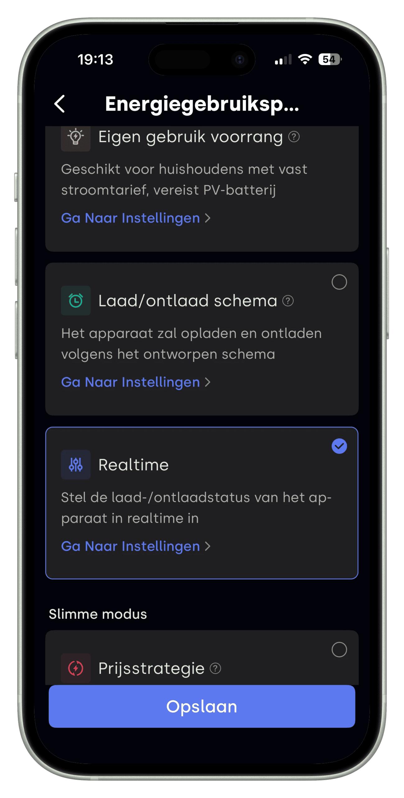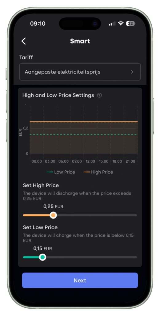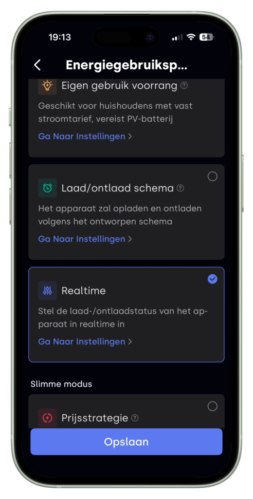 - ‘Prijsstrategie’: heb je dynamisch elektriciteitsprijzen dan kun je met deze keuze het laden en ontladen laten bepalen op basis van de meest gunstigste prijzen.