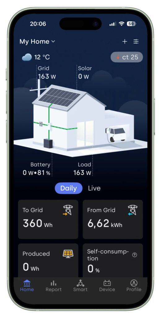 - ‘Eigen verbruik voorrang’: Deze modus is in feite een variant op het ‘Nul-op-de-meter’-principe. Bij een overschot aan zonne-energie wordt de batterij automatisch geladen. Zodra er energie van het net wordt afgenomen, schakelt het systeem over op ontladen. In de praktijk betekent dit: laden overdag en ontladen in de avond en nacht. Je hebt ook nog de keuze om overproductie van je zonnepanelen bij een volle batterij naar het net te exporteren.