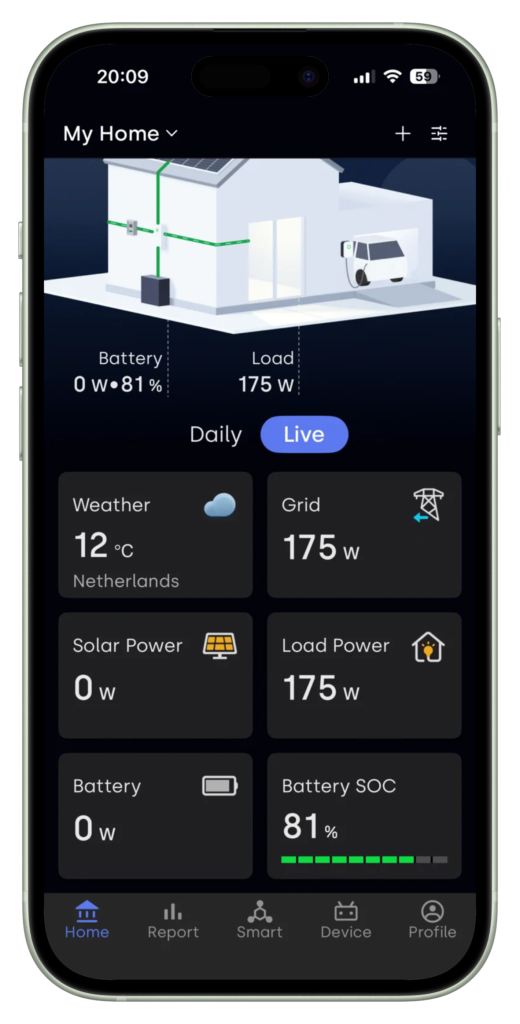 Daarbij houdt het systeem rekening met de actuele batterijstaat, dynamische elektriciteitsprijzen en andere relevante factoren. In tegenstelling tot een modus die alleen stuurt op stroomprijs, zorgt deze slimme, voorspellende regeling ervoor dat de batterij op het juiste moment wordt geladen vanuit het net of vanuit de zonnepanelen, en ontladen naar het huis wanneer dit het meest rendabel is. Dit resulteert in een efficiënter gebruik van de beschikbare energie en als het goed is lagere maandelijkse kosten. Dit is daarmee een ideale set-and-forget instelling voor huishoudens die zich niet teveel met de batterij willen bezighouden.