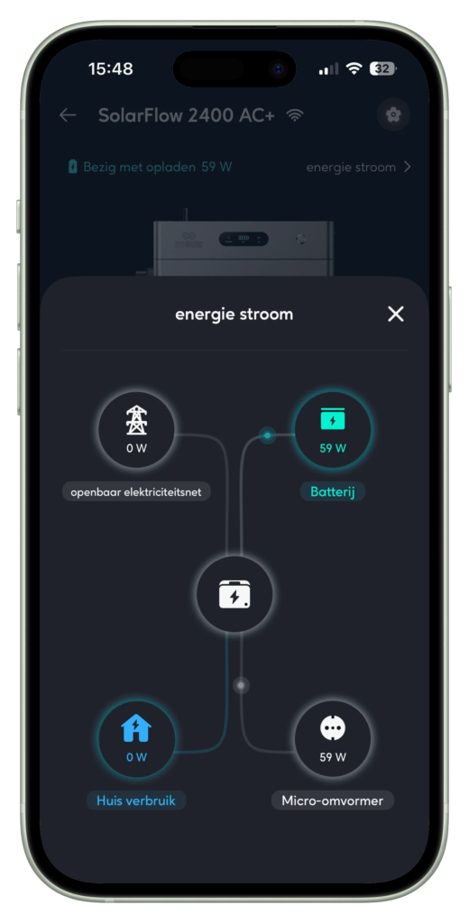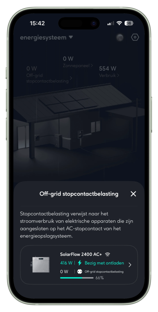 - Opslagcapaciteit Basisbatterij van 2,4 kWh (LiFePO₄), uitbreidbaar tot 16,8 kWh