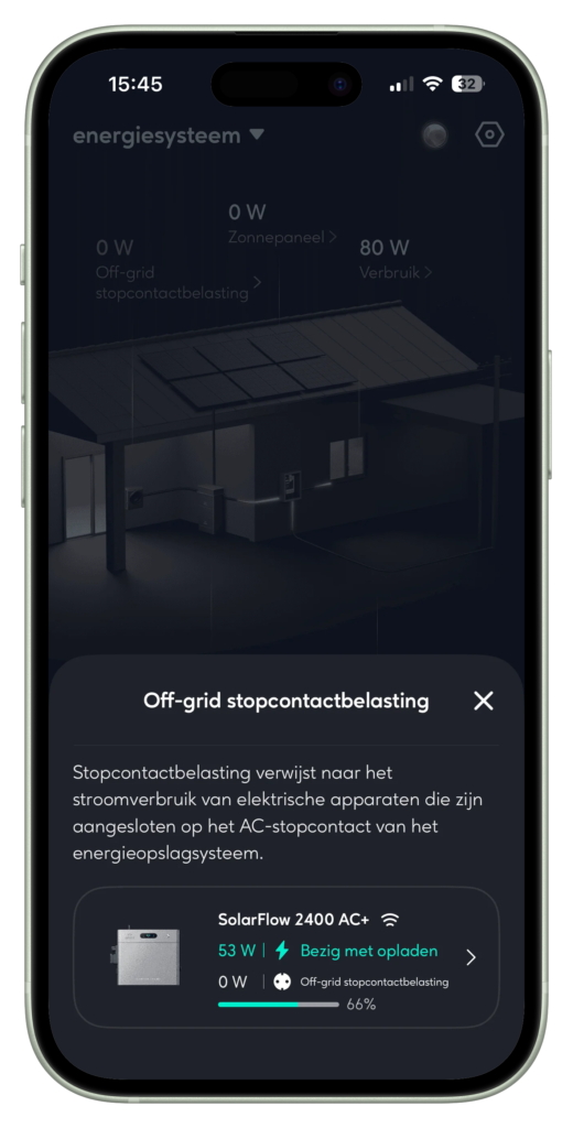 - Vermogen AC‑uitgang van 0–800 W via een standaard stopcontact en tot 2400 W op een eigen groep met vaste aansluiting