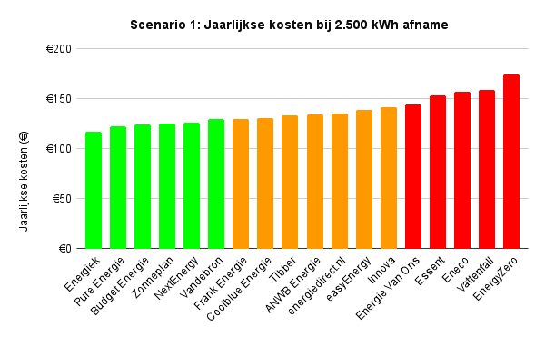 Conclusie scenario 1: De prijsverschillen tussen leveranciers bij uitsluitend afname zijn beperkt. De drie grote spelers (Essent, Eneco en Vattenfall) volgen elkaar nauwgezet en rekenen vrijwel identieke tarieven, die wel iets hoger liggen dan bij kleinere aanbieders. Het verschil met de rest van de markt blijft echter gering.