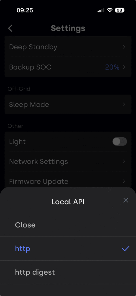 De BK1600 Ultra beschikt over een volledige lokale API! Dit is een groot voordeel voor powerusers. Op deze wijze kun je de batterij vanuit bijvoorbeeld Home Assistant of een ander home automation systeem volledig uitlezen en aansturen zonder daarbij afhankelijk te zijn van de cloud. Je hebt binnen de lokale API de keuze om binnen je lokale netwerk met of zonder authenticatie te werken. Om de lokale API te activeren, moet je eerst onder je profiel(account) een “directe apparaatverbinding” maken. Zoek vervolgens in de instellingen de optie voor de lokale API. Als je SSL of andere beveiligingsmaatregelen wilt overslaan, kies dan voor HTTP.