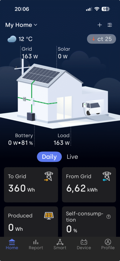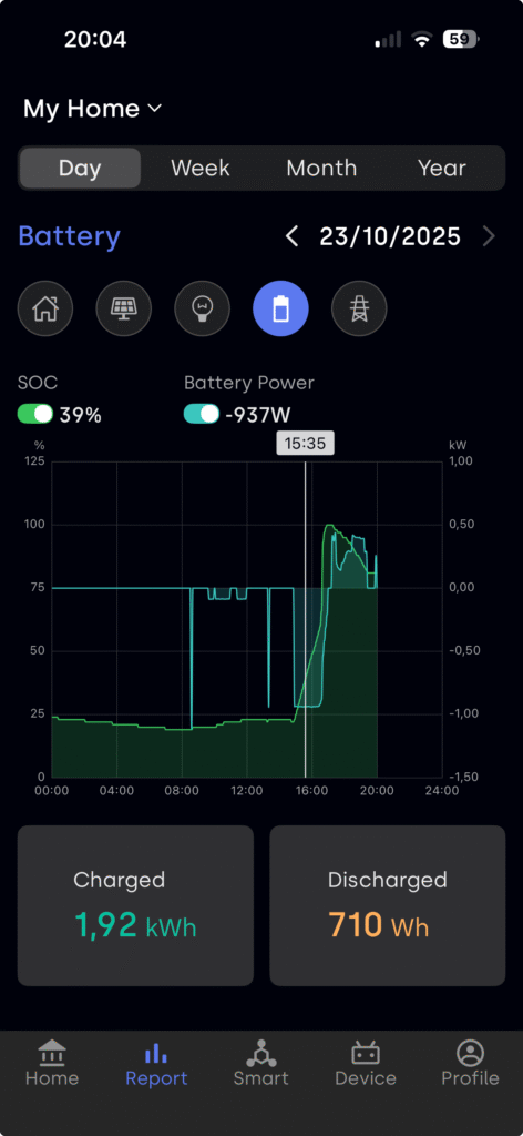 Het hoofdscherm van de Indevolt-app oogt overzichtelijk en aantrekkelijk. Onderaan vind je de keuze ‘Report’ met handige grafieken die het energieverbruik over verschillende perioden laten zien.