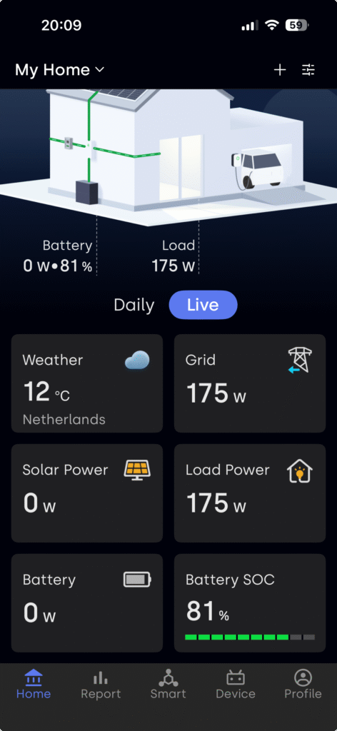 De configuratie van de BK1600 Ultra verliep vlot en was binnen ongeveer tien minuten afgerond. Het koppelen van de BK1600 Ultra aan de app ging probleemloos. Ook het koppelen van de bij ons al in gebruik zijnde Shelly Pro 3EM ging goed, de batterij herkende de meter meteen. De data werd netjes en volledig ingelezen. We hebben als extra test ook de meegeleverde Solarman P1-2W gekoppeld en gebruikt en ook dat liep probleemloos.