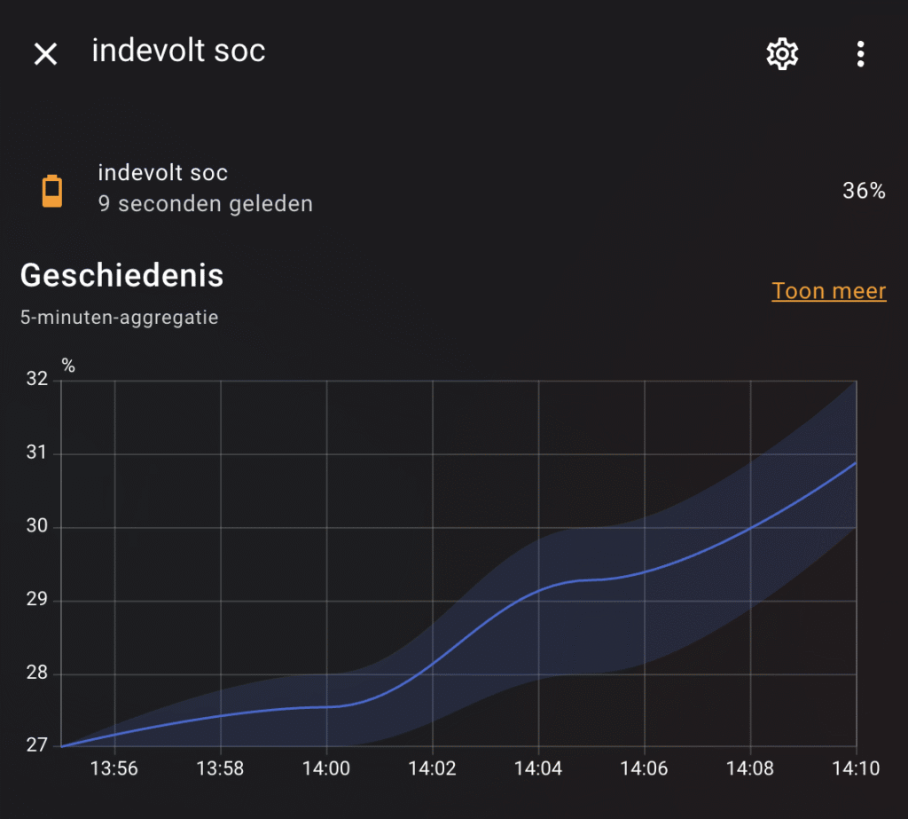 - Koppelen met de app – Download de Indevolt app, verbind de batterij via WiFi en doorloop de configuratie. Dit wijst zich redelijk vanzelf. Hier kun je ook handmatig laad- en ontlaadinstellingen beheren (ook via een schema). En voor een specifieke modus kiezen, en zie je meteen hoeveel energie wordt opgeslagen via pv of via ac en hoeveel het huis verbruikt.
