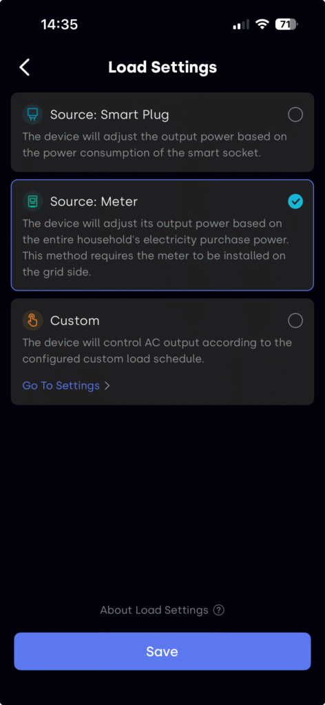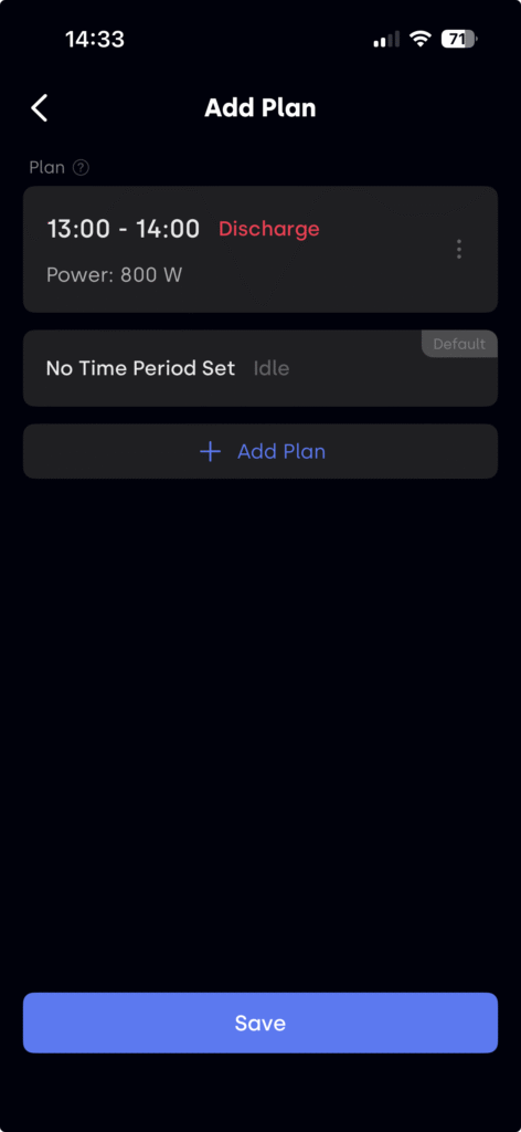Naast de NOM modus kun je ook een smartstekker als bron selecteren(zie foto hierboven voor de 3 mogelijkheden). De batterij zal dan het verbruik van het apparaat dat op de smartstekker is aangesloten automatisch compenseren. Daarnaast kun je hier ontlaadwaarden instellen op basis van een vast schema, echter alleen op uren en niet op dagen van de week.