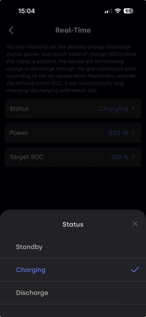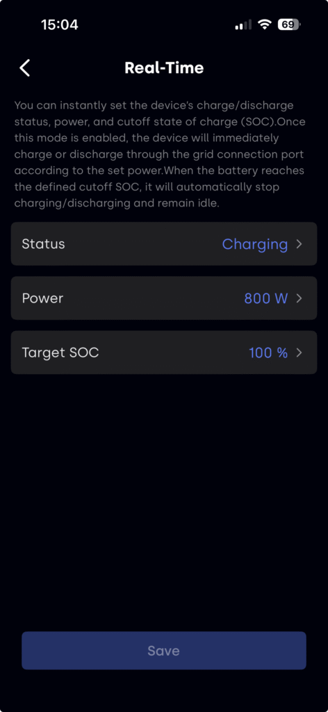 In de realtime-modus kun je de batterij direct laten laden of ontladen, zonder gebruik te maken van schema’s of externe stuurapparaten zoals smartstekkers of de P1-meter. Daarnaast kun je via een state of charge (SoC)-instelling bepalen tot welk laad- of ontlaadniveau de batterij mag werken. Zo kun je de batterij snel en flexibel inzetten, met als extra voordeel dat er een aparte SOC-instelling beschikbaar is voor deze modus.
