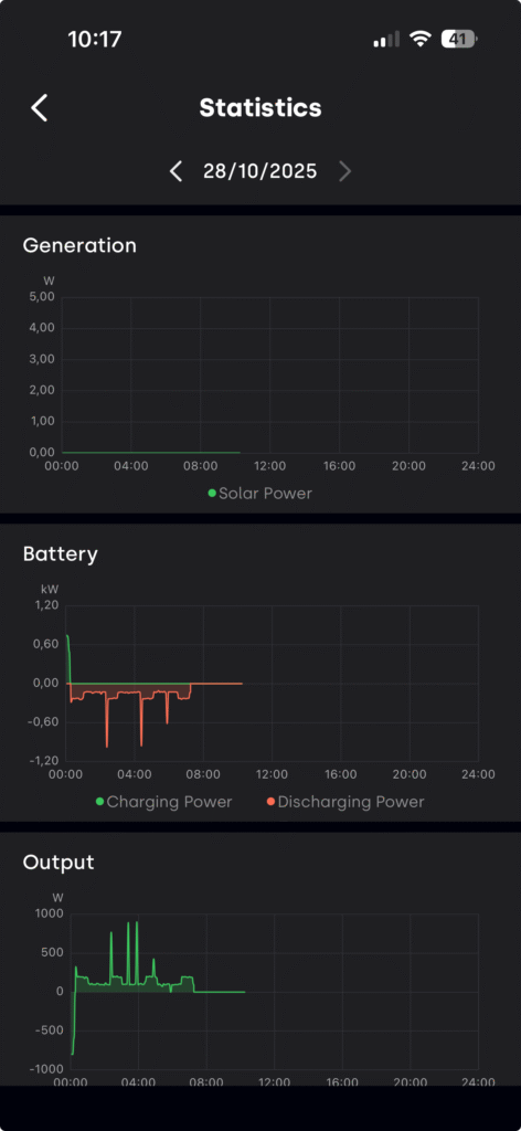 Tijdens een nachtelijke test activeerden we de ‘Eigen gebruik voorrang met slimme meter’-strategie om de effectiviteit te beoordelen. In de onderstaande screenshots is de data van de P1-meter te zien, met import- en exportwaarden tussen 00:00 en 06:00 uur. Zoals op afbeelding 1 te zien is, weet de BK1600 Ultra het verbruik uitstekend te balanceren: de meter blijft vrijwel op nul.