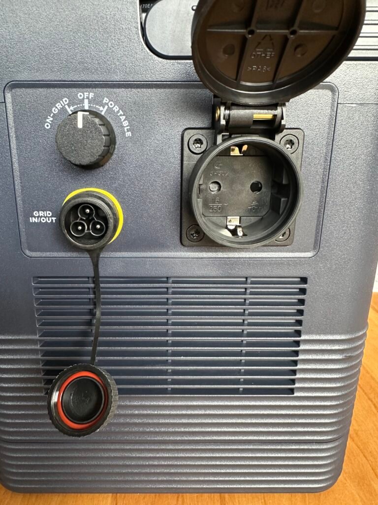 - ‘Outdoor Portabel‘ In deze stand fungeert de batterij als een echte draagbare batterij. Hij ontlaadt zich zodra er een apparaat op de off-grid ingang wordt aangesloten en begint direct weer op te laden zodra de batterij weer op het AC-net is aangesloten.