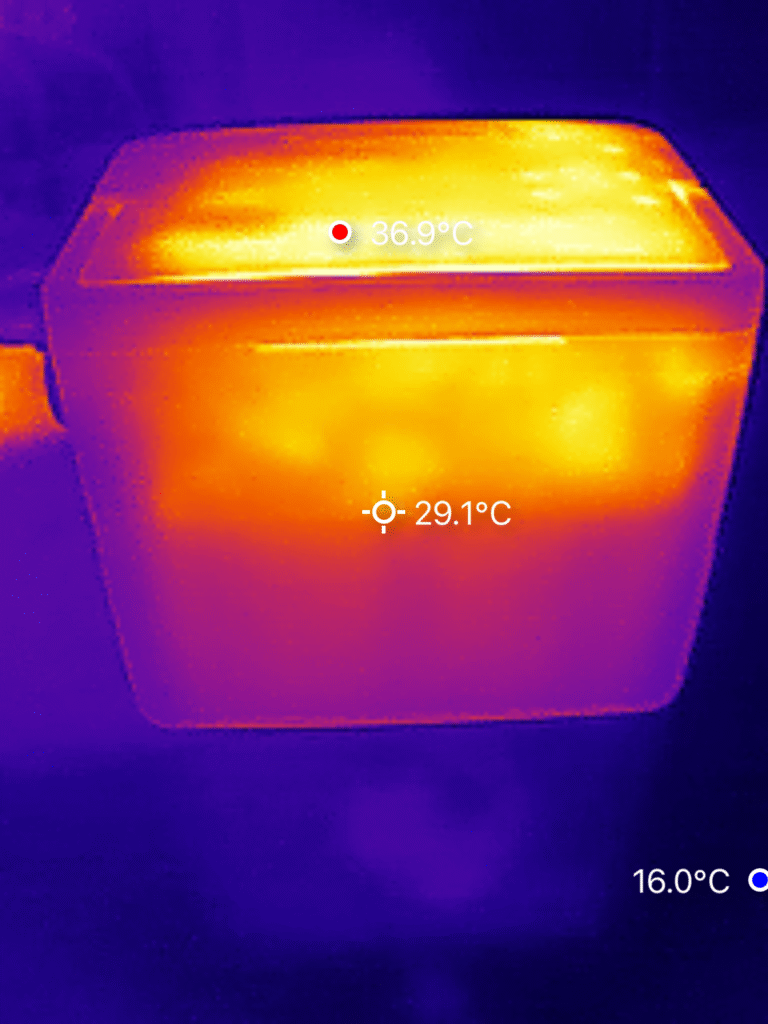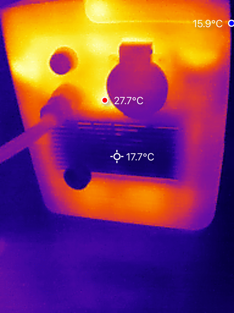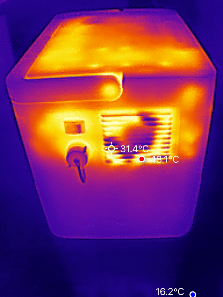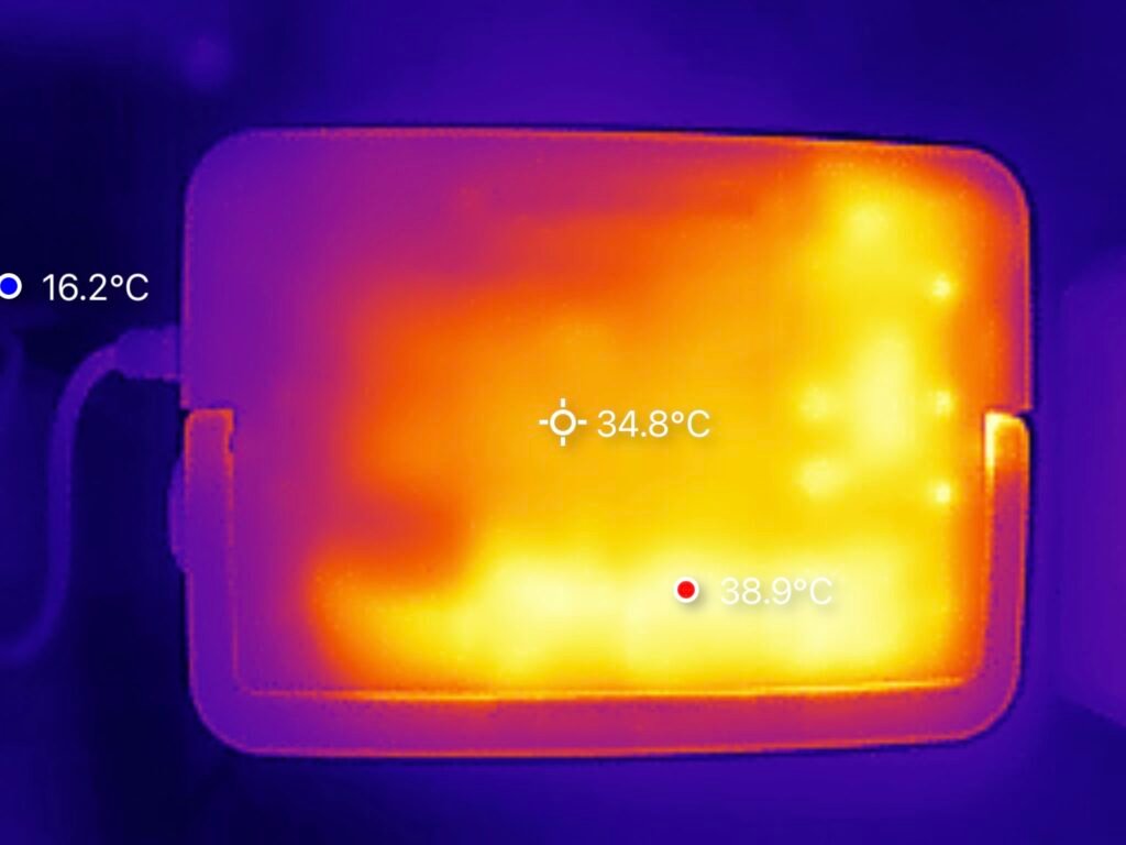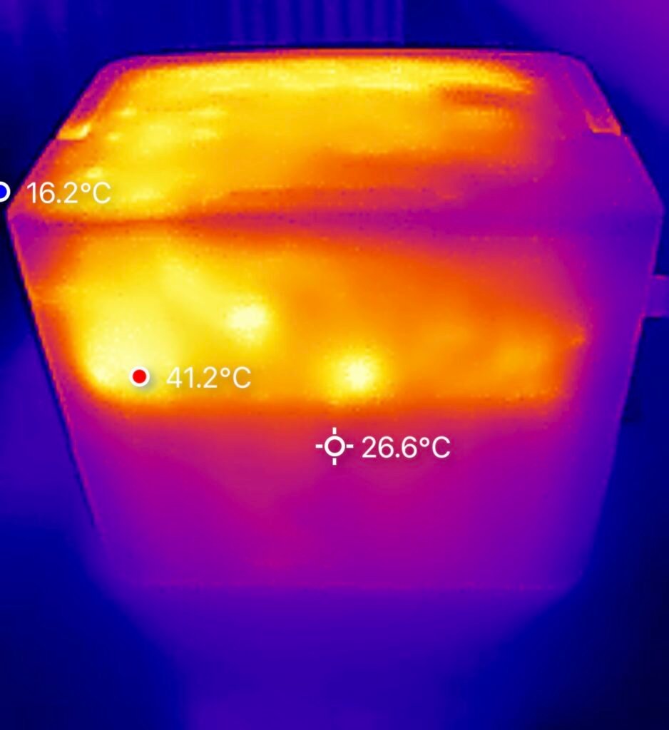 Deze warmtebeelden zijn vastgelegd terwijl de BK1600 Ultra gedurende lange tijd 800W heeft ontladen. Uit de temperatuurmetingen blijkt dat de actieve koelstrategie effectief functioneert: de hoogste geregistreerde temperatuur bedraagt 43°C. Dit resultaat onder langdurige belasting is prima en wijst op een efficiënte warmteafvoer.