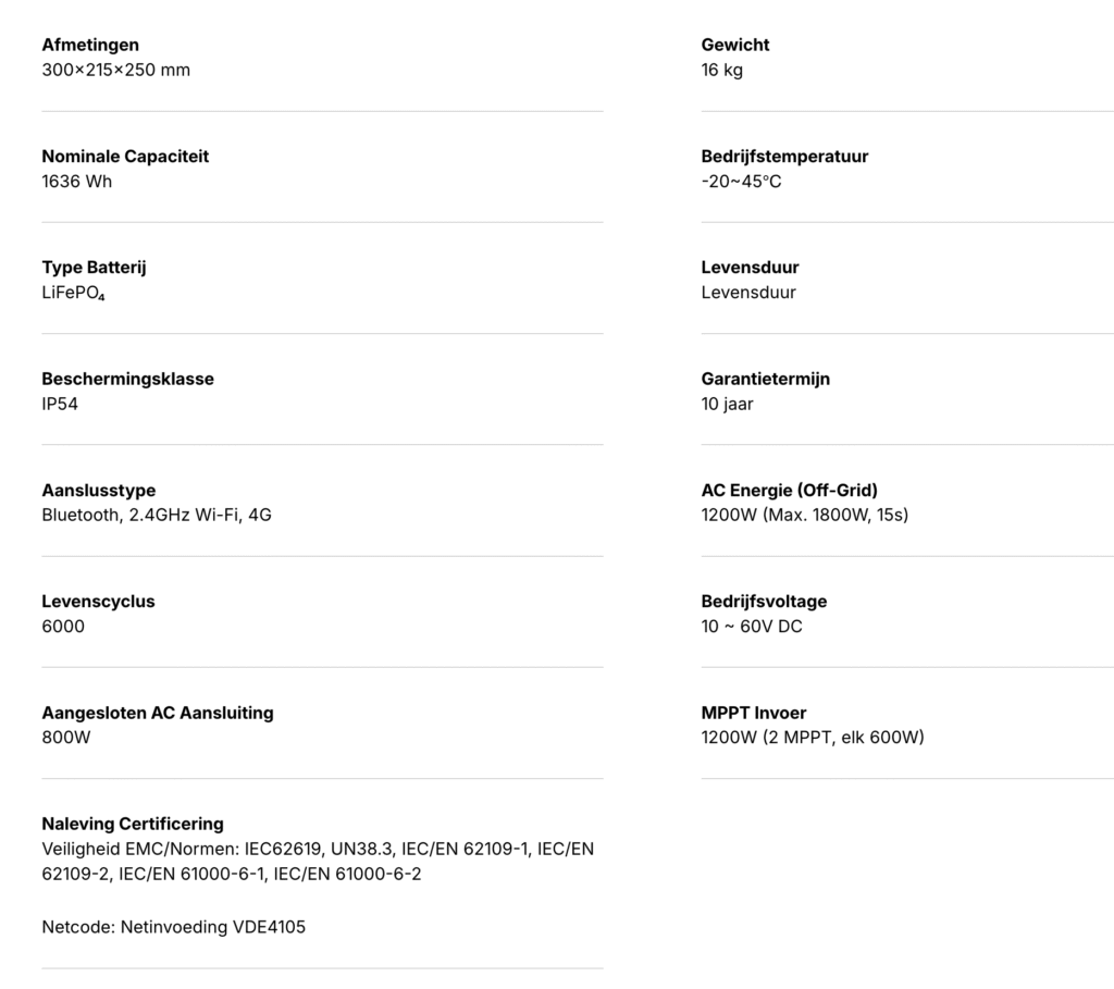 - Capaciteit: beperkte startcapaciteit van 1,6 kWh, wel mogelijkheid van clusteren