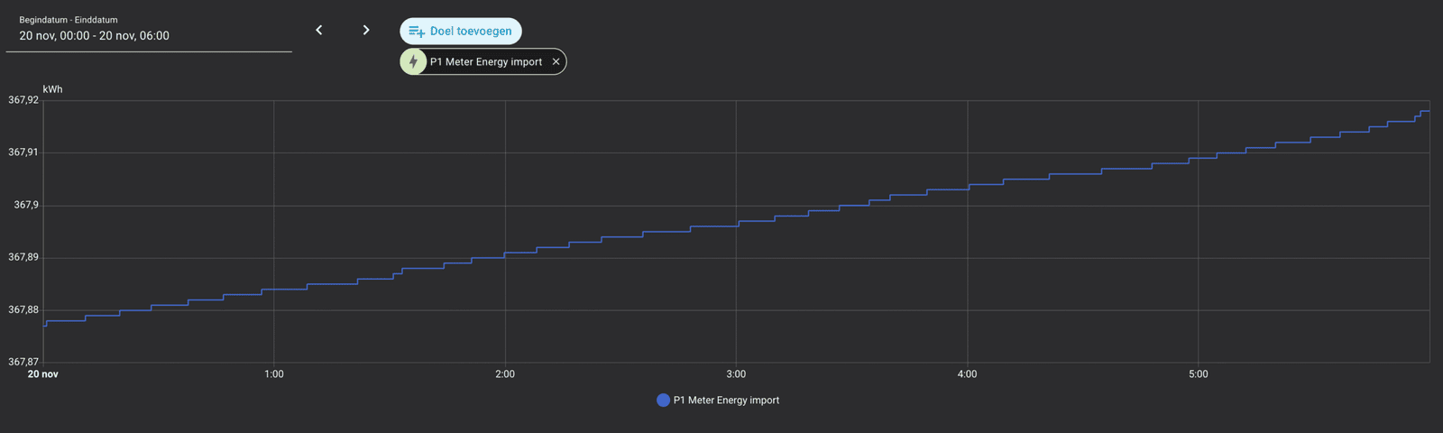 Tijdens een nachtelijke test activeerden we de ‘Eigen gebruik voorrang met slimme meter’-strategie om de effectiviteit te beoordelen. In de onderstaande screenshots is de data van de P1-meter te zien, met import- en exportwaarden tussen 00:00 en 06:00 uur. Zoals op afbeelding 1 te zien is, weet de BK1600 Ultra het verbruik uitstekend te balanceren: de meter blijft vrijwel op nul.