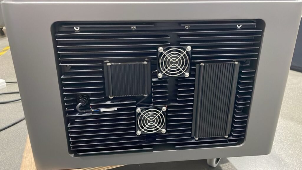 De achterkant bestaat uit metalen koelribben en ook een actieve koeling door middel van 2 kleine ventilatoren.