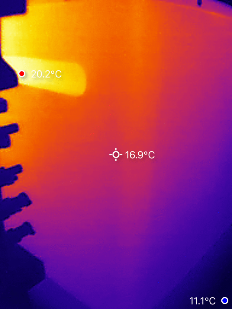 🌡️ Met een warmtebeeldcamera hebben we de warmteontwikkeling van de X2400 AC gemeten na circa drie uur laden met 1000 W. De hoogste temperatuur, 46°C, werd geregistreerd aan de achterzijde; alle overige metingen lagen lager. Vergelijkbare waarden komen ook bij andere batterijmerken voor.
