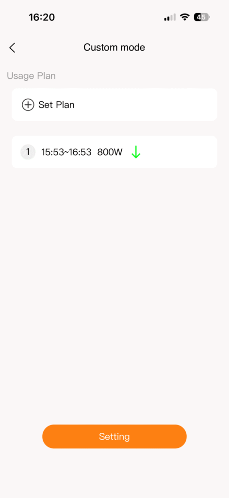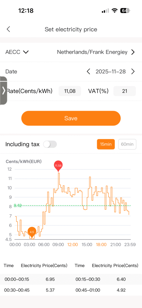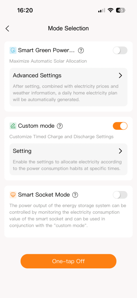 - Custom mode: In deze stand kun je zelf vaste laad- en ontlaadtijden instellen over de dag, inclusief het gewenste vermogen per tijdsblok.