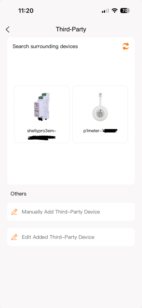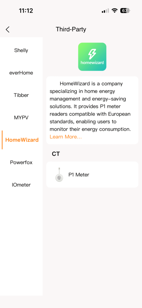 - P1 meter of CT klemmen: koppel de P1 meter met je slimme meter en voeg deze toe in de app als nieuw device. Wij gebruiken in dit geval de Homewizard P1 meter. Je hebt hierbij keuze uit verschillende opties van P1 meters en CT klemmen: