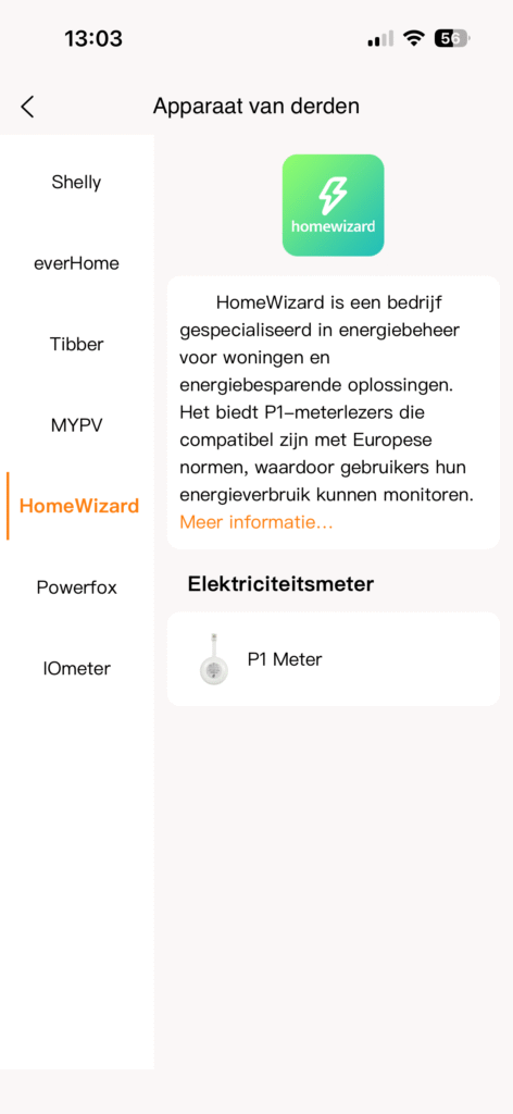 - Homewizard: Voeg de P1 meter aan de Homewizard app toe (zie handleiding Homewizard)