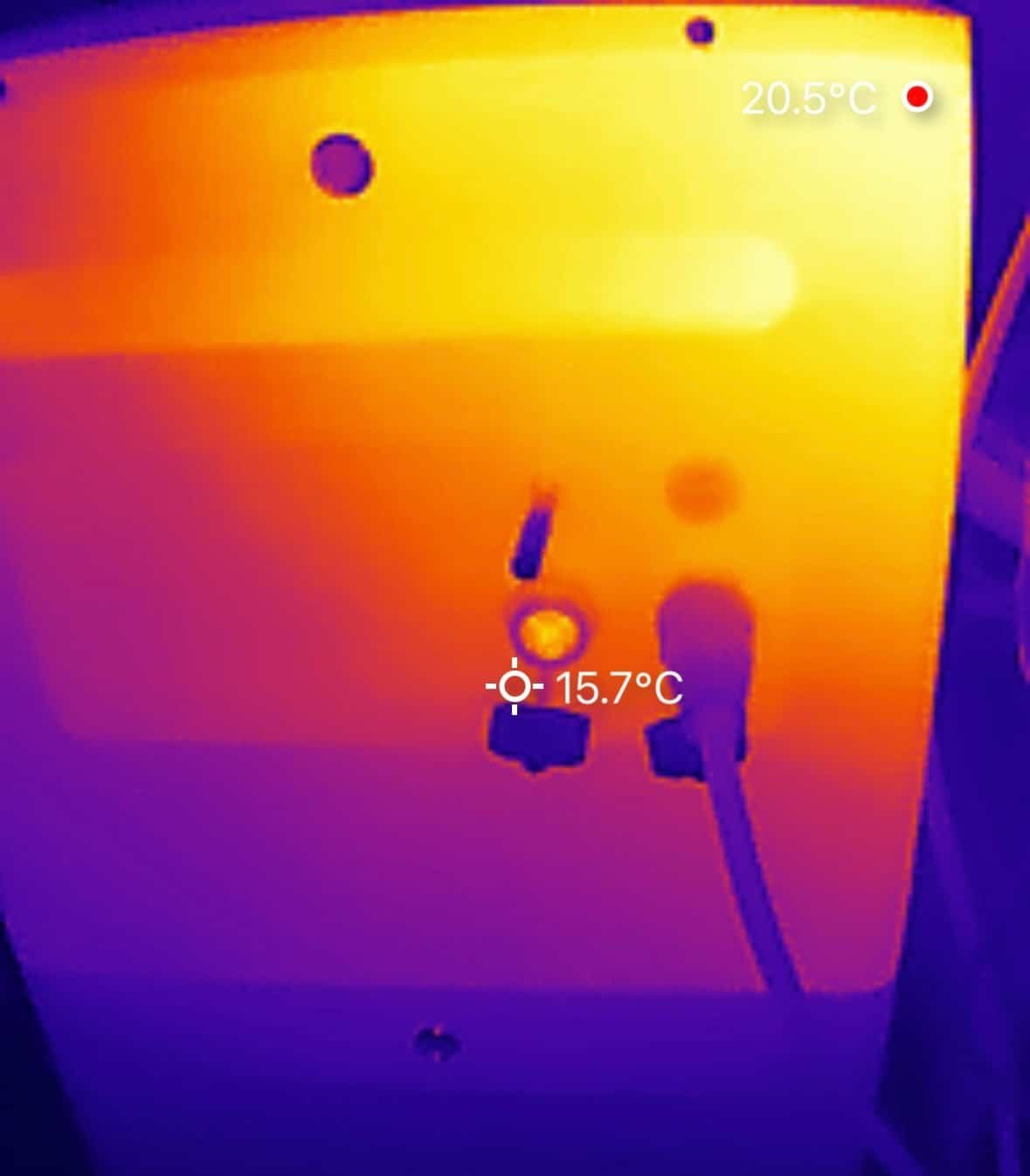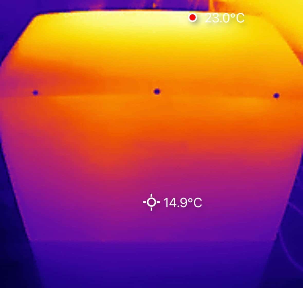🌡️ Met een warmtebeeldcamera hebben we de warmteontwikkeling van de X2400 AC gemeten na circa drie uur laden met 1000 W. De hoogste temperatuur, 46°C, werd geregistreerd aan de achterzijde; alle overige metingen lagen lager. Vergelijkbare waarden komen ook bij andere batterijmerken voor.