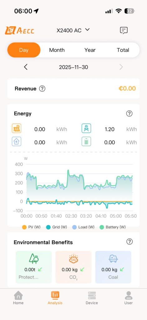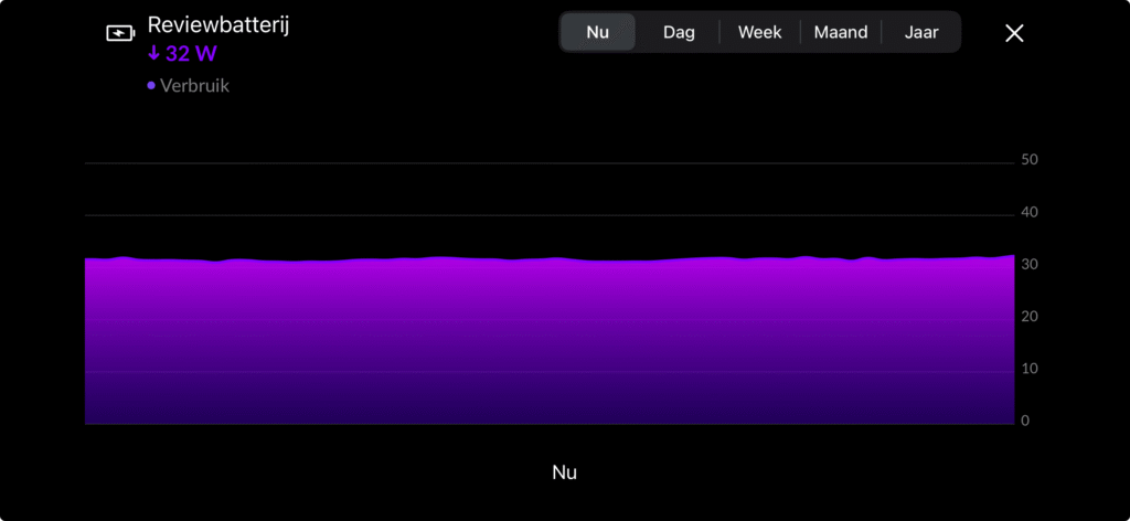 Stand-by verbruik bedraagt 32Wvoor de X2400 AC. Dit is met een Homewizard Energy Socket gemeten. Deze waarde is gemeten terwijl de batterij in de ‘Custom Mode’ staat en wacht tot het schema aangeeft dat hij moet starten met laden. Dit zou met een geactiveerde ‘Energy saving mode’ lager moeten zijn maar dat werkt nog niet, en wordt in een firmware update meegenomen.