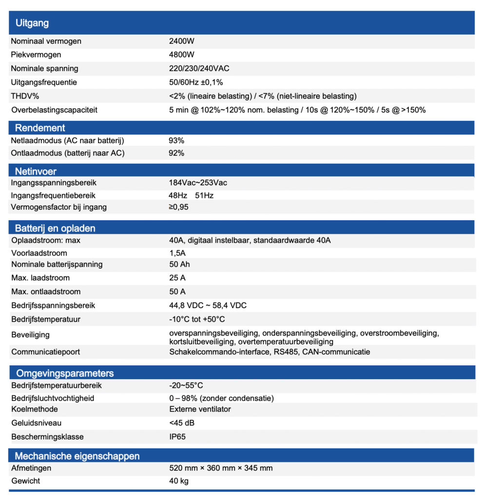 📌 Let op: Zodra het totale uitgangsvermogen boven de 800 W komt, is het noodzakelijk om de batterij aan te sluiten op een aparte groep in de meterkast — dus niet samen met andere apparaten. Laat dit altijd controleren of installeren door een erkend elektricien, zodat alles veilig gebeurt en voldoet aan de geldende normen.