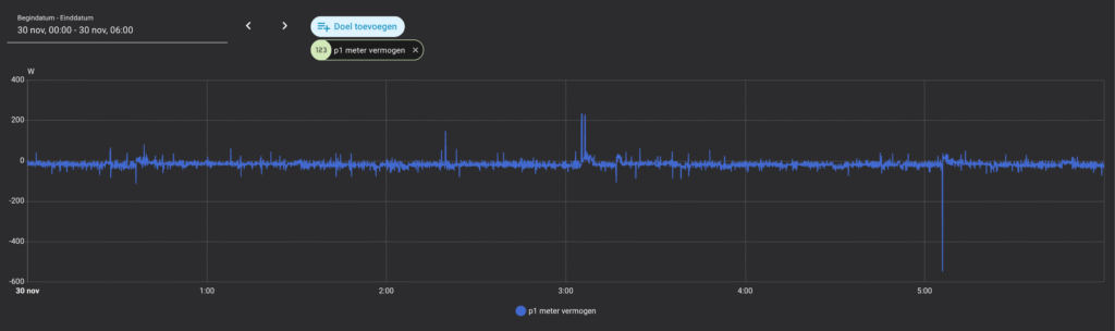 De onderstaande screenshots tonen de P1-meterdata met import- en exportwaarden tussen 00:00 en 06:00 uur. Zoals in afbeelding 1 zichtbaar is, weet de X2400 AC het verbruik uitstekend te balanceren: de netimport blijft vrijwel op nul.
