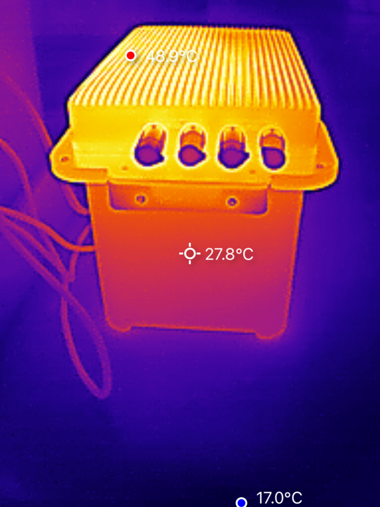 We hebben de warmteontwikkeling van de SolarFlow 800 Plus onderzocht met behulp van een warmtebeeldcamera. De metingen zijn uitgevoerd nadat het systeem ca. anderhalf uur lang aan het laden was met het maximale vermogen van 1.000 W. De hoogste waarde werd geregistreerd aan de achterzijde bovenop het apparaat, met een temperatuur van 47 °C. Alle overige meetpunten lagen lager. Dit soort temperaturen zie je ook bij andere batterijmerken.
