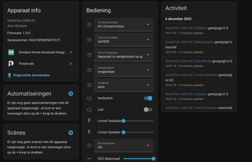 Zendure heeft een officiele Home Assistant integratie waarmee een volledige lokale aansturing van de batterijen mogelijk is. Inclusief een aantal standaard aanstuur modi waarbij 1 of verschillende Zendure stekkerbatterijen ook als 1 virtuele batterij kunnen samenwerken.