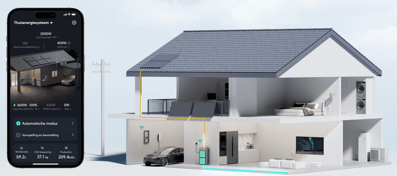 | Slimme functies | AI‑gestuurd HEMS voor dynamische tarieven, automatische verdeling tussen gebruik, opslag en teruglevering |