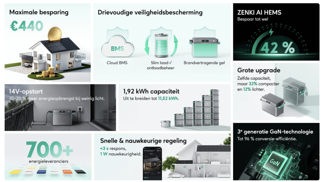 - 📱 Besturing & integratie Zendure‑app (WiFi/Bluetooth) met modi Zenki, Auto en Expert.