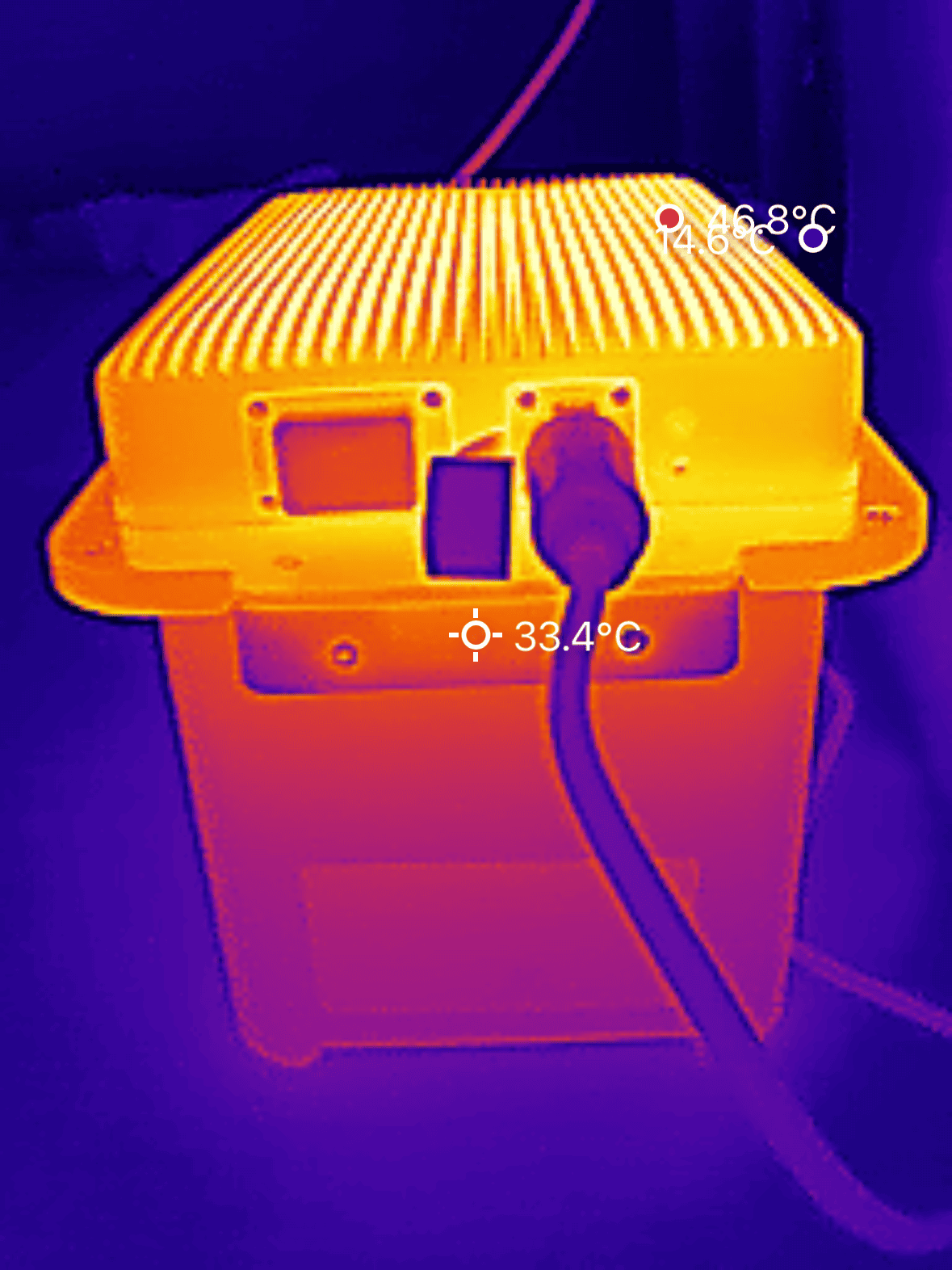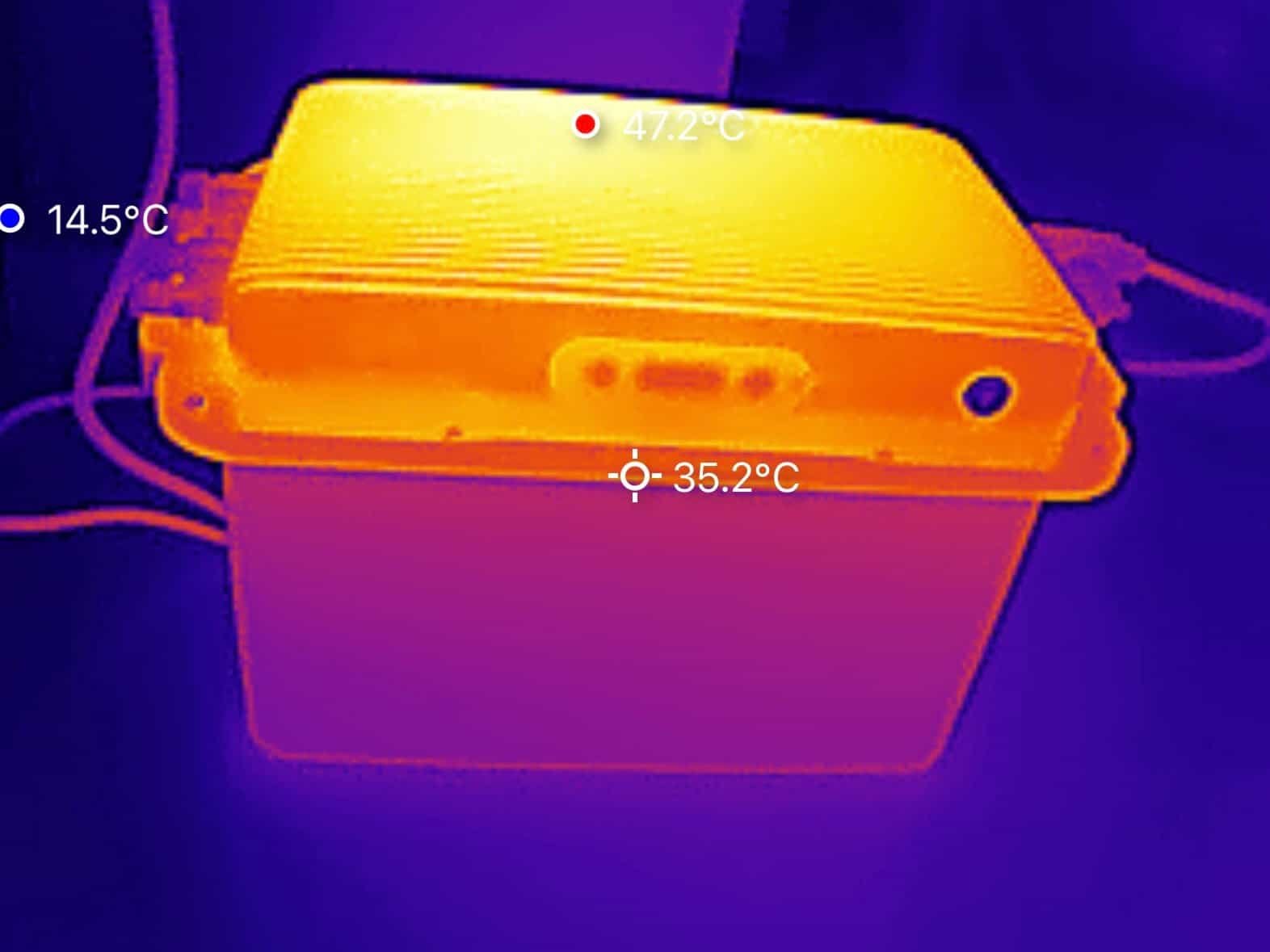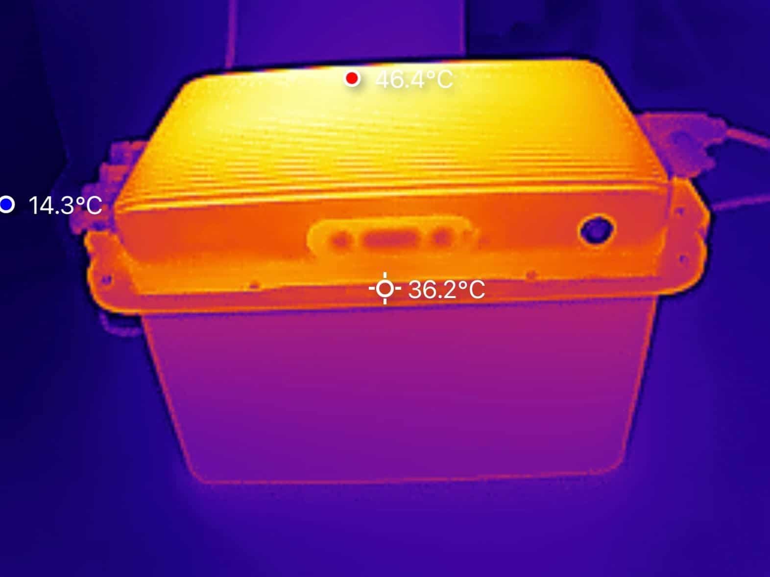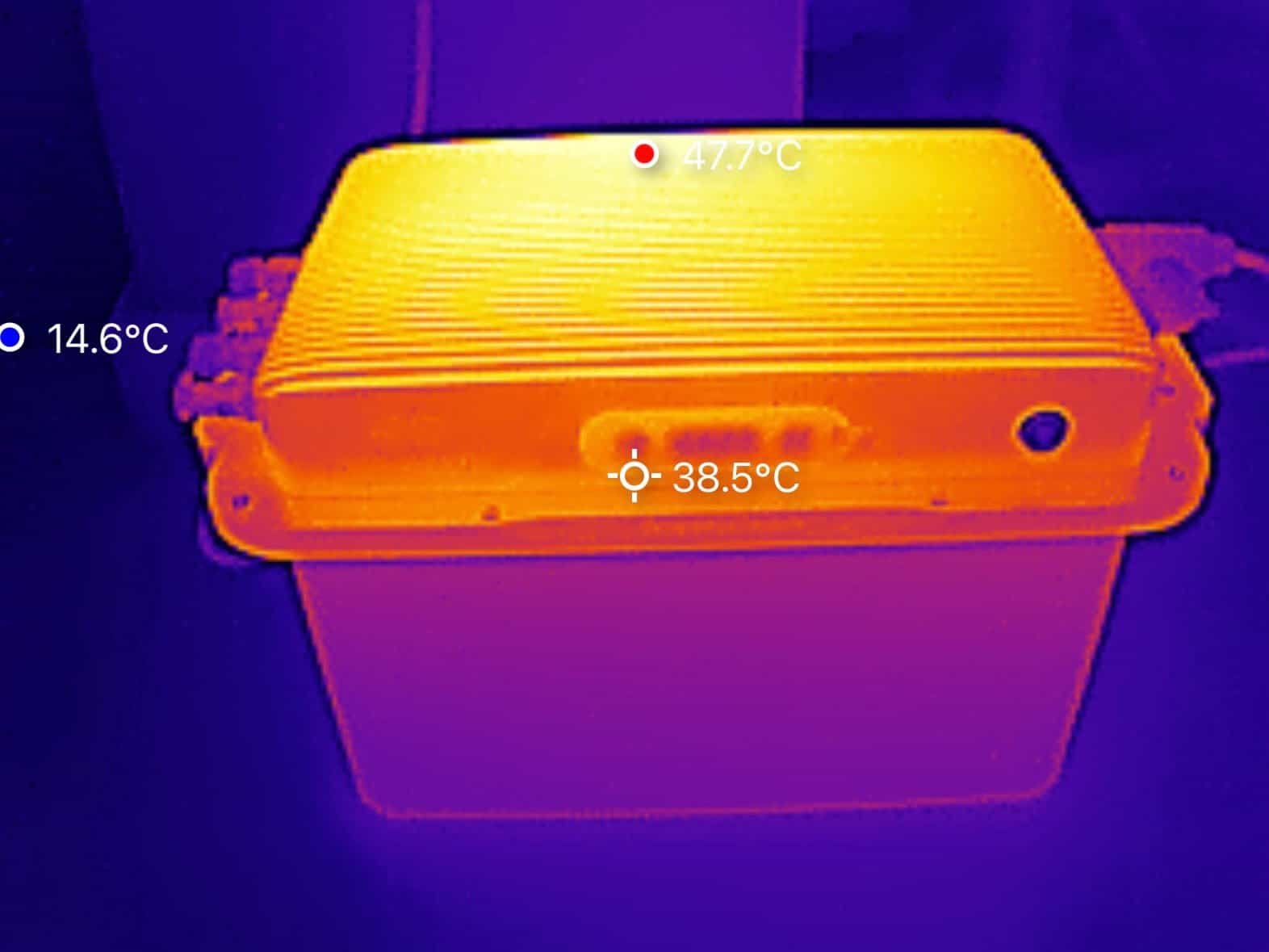 We hebben de warmteontwikkeling van de SolarFlow 800 Plus onderzocht met behulp van een warmtebeeldcamera. De metingen zijn uitgevoerd nadat het systeem ca. anderhalf uur lang aan het laden was met het maximale vermogen van 1.000 W. De hoogste waarde werd geregistreerd aan de achterzijde bovenop het apparaat, met een temperatuur van 47 °C. Alle overige meetpunten lagen lager. Dit soort temperaturen zie je ook bij andere batterijmerken.