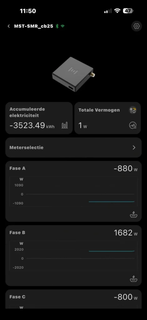 De Jupiter C+ kan worden aangestuurd via een Marstek P1‑meter (CT003) of met Shelly‑ of Marstek‑stroomklemmen (CT002). Gebruik je de Marstek P1‑meter – zoals wij tijdens onze tests – dan is de installatie bijzonder eenvoudig. Kies je voor stroomklemmen, dan moet er in de meterkast worden gewerkt en is het geheel minder plug‑and‑play. Daarmee verdient de Marstek P1‑meter duidelijk de voorkeur.