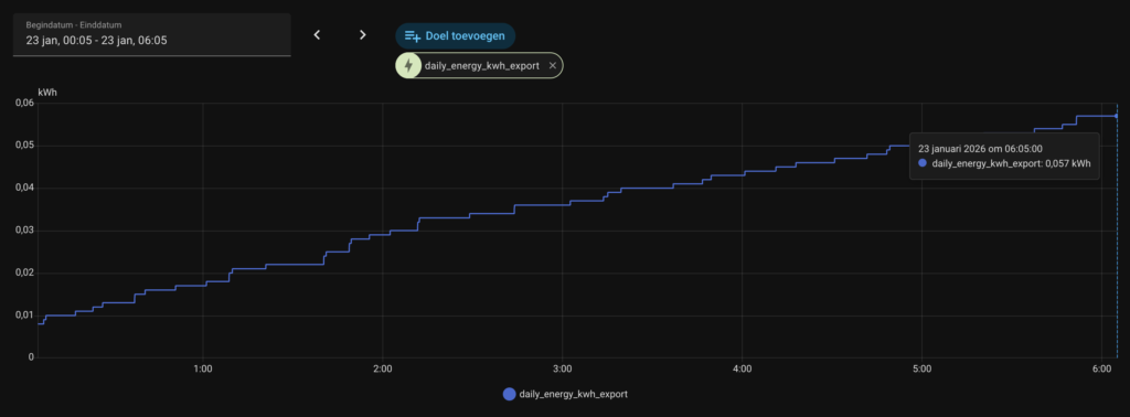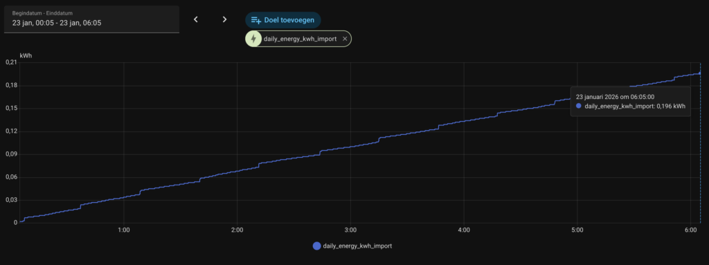 Over deze zes uur bedroeg de totale netimport slechts 0,196 kWh en de export 0,057 kWh — bijzonder goede resultaten. De Marstek toont hiermee aan dat, in combinatie met een DSMR 5.0 slimme meter (met een uitleesinterval van één seconde) een nauwkeurige Nul-op-de-Meterregeling uitstekend haalbaar is.