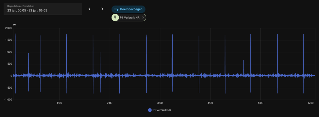 Tijdens een nachtelijke test hebben we de ‘Nul-op-de-Meter’-strategie geactiveerd om de effectiviteit ervan te beoordelen. De gemiddelde load in de nacht was tussen de 70 en 150W. In de screenshots hieronder is de data van de P1-meter zichtbaar, met import- en exportwaarden tussen 00:05 en 06:05 uur. Zoals te zien op afbeelding 1, weet de Marstek het verbruik uitstekend te balanceren: de meter blijft vrijwel op nul. Kleine uitschieters zijn zichtbaar, voornamelijk veroorzaakt door het inschakelen van de quooker.