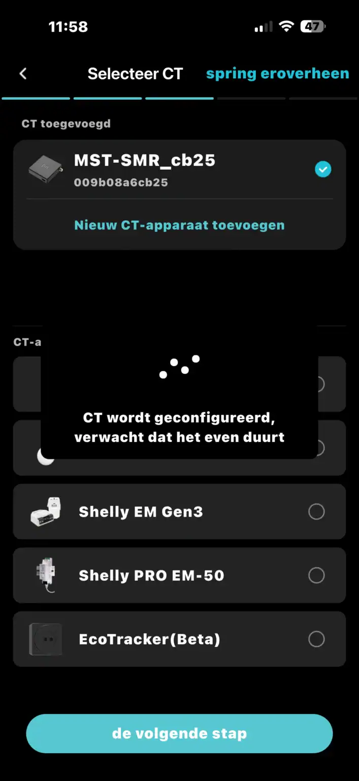 Kies linksonder op het standaardscherm voor CT. Daarna krijg je de mogelijkheid om de CT te wijzigen en te kiezen voor de apparaten die ondersteund worden. In ons geval kiezen we voor Shelly CT klemmen en die wordt netjes herkend en toegevoegd en de data wordt daarna getoond. Ook de P1 van Marstek (CT003) hebben we eerder al geprobeerd en werkt ook probleemloos.