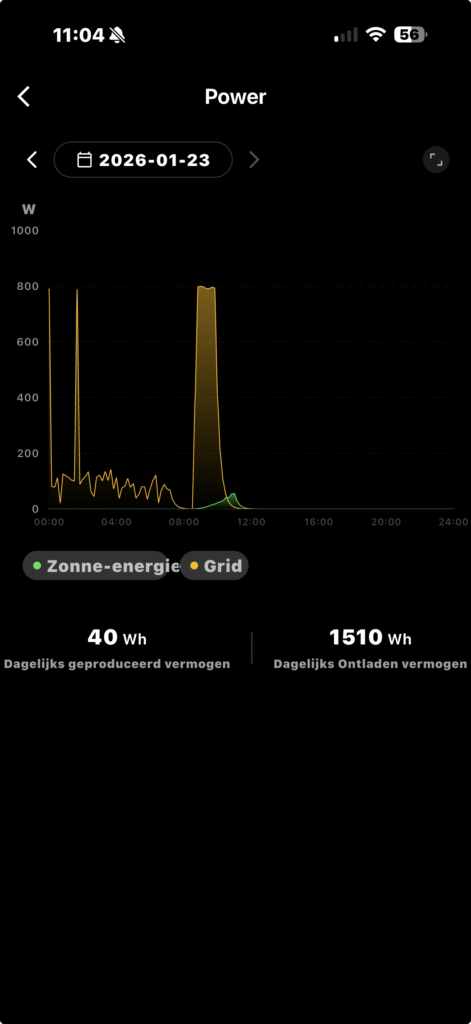 Wanneer de batterij volledig is opgeladen, wordt de zonnepaneelopbrengst automatisch doorgestuurd naar het huis of het net — dit is de zogenaamde bypassfunctie. Deze werkt tot een maximum van 800 W , wat belangrijk is om in gedachten te houden. In de praktijk betekent dit dat op zonnige dagen in het voorjaar of de zomer, wanneer de batterij al vol is en de zon nog volop schijnt, een deel van de opgewekte stroom niet benut kan worden vanwege deze injectielimiet. Een alternatieve strategie kan zijn om op zonrijke dagen de batterij actief te blijven ontladen richting het huis, zodat het langer duurt voordat deze vol raakt en er meer ruimte blijft voor PV-opslag.
