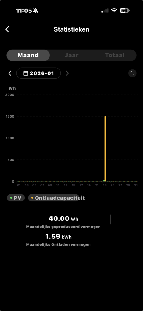 We hebben één zonnepaneel van 425Wp aangesloten op PV4 , en zoals verwacht functioneert dit probleemloos. Via het hoofdscherm toont de Marstek realtime hoeveel energie wordt binnengehaald. In het statistiekenscherm is vervolgens een gedetailleerd overzicht beschikbaar, waarbij je de opbrengst kunt volgen per maand, jaar en totaal.