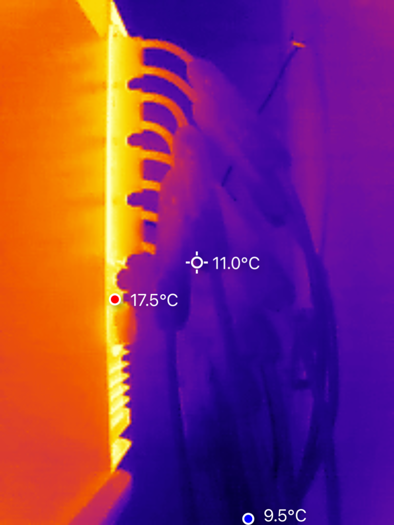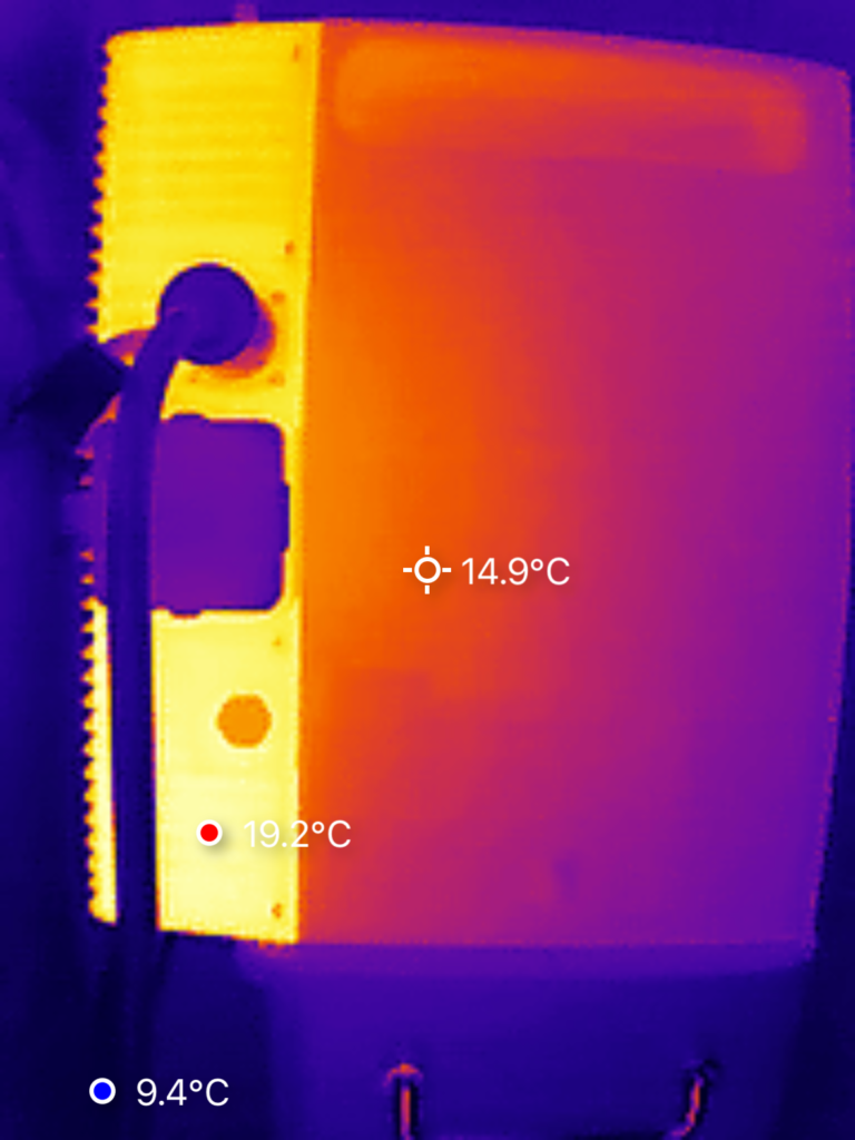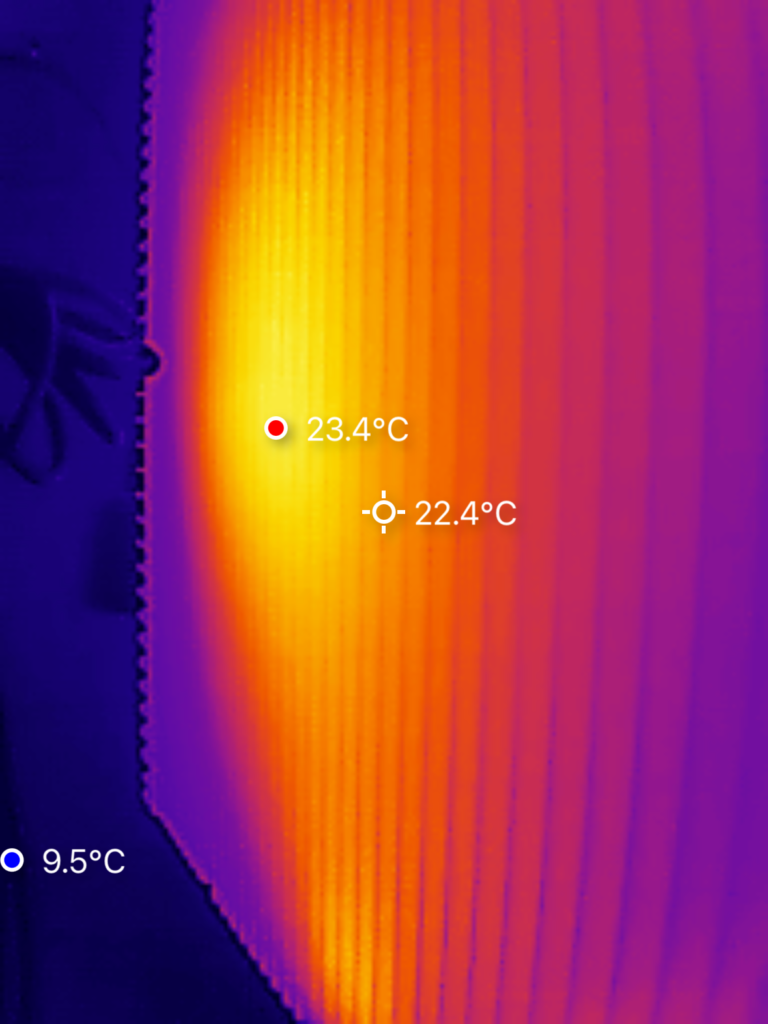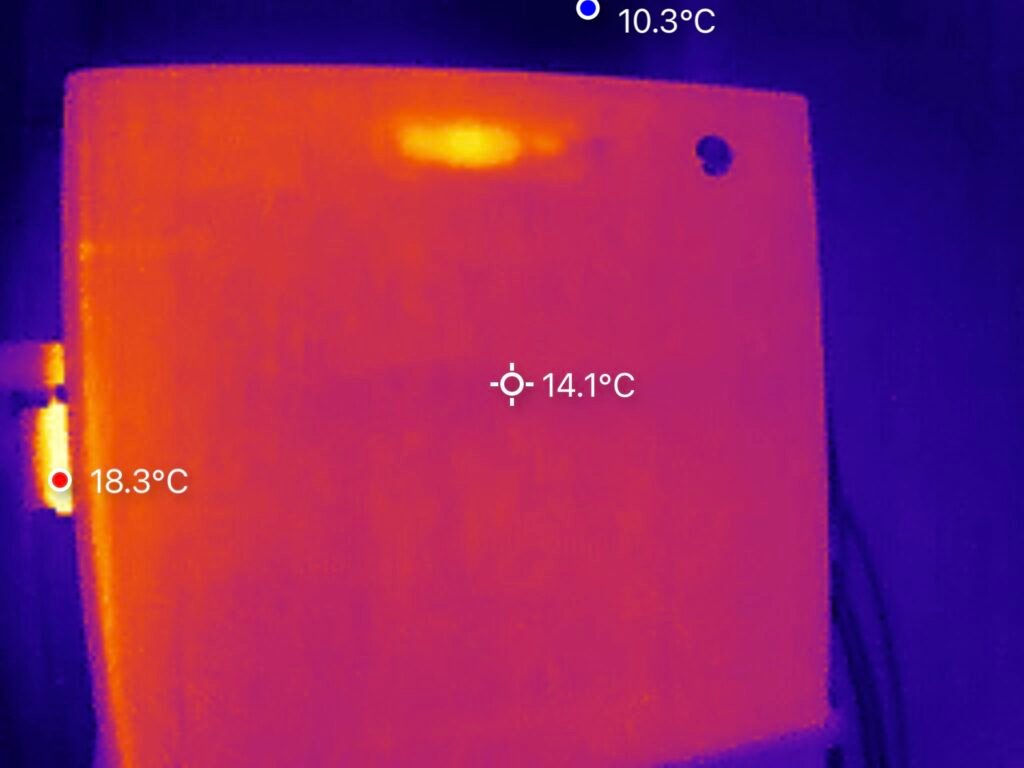 We hebben de warmteontwikkeling van de SolarFlow 2400 Pro onderzocht met behulp van een warmtebeeldcamera. De metingen zijn uitgevoerd nadat het systeem ca. twee uur lang aan het laden was met een vermogen van 800 W. De hoogste waarde werd geregistreerd aan de achterzijde van het apparaat, met een temperatuur van 24 °C. Alle overige meetpunten lagen lager.