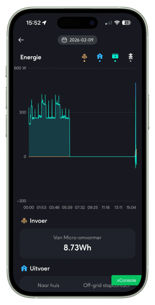 Het off-grid stopcontact ondersteunt tevens het aansluiten van zonnepanelen via een micro-omvormer. Wij hebben dit succesvol getest met onze APsystems EZ1-M en twee 440 Wp zonnepanelen. Wanneer de batterij is verbonden met het huisnet, laadt de batterij op via de micro-omvormer terwijl apparaten op ditzelfde off-grid stopcontact gelijktijdig van stroom worden voorzien. In eilandmodus is het beperkt tot enkel het aansluiten van verbruikers. Hiervoor dient in de instellingen van de batterij wel de Off-grid-modus te worden geactiveerd. Hieronder zie je de resultaten. Het is weliswaar slechts 25 W, maar dat is gemeten op een dag waarop de zonnepanelen besneeuwd waren en dus nauwelijks iets produceerden.
