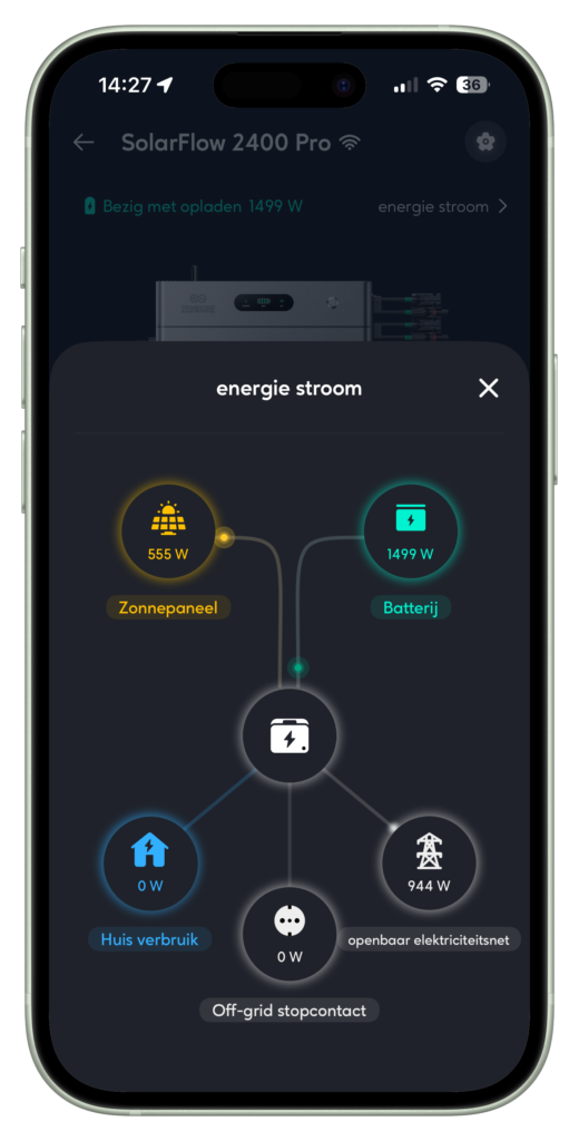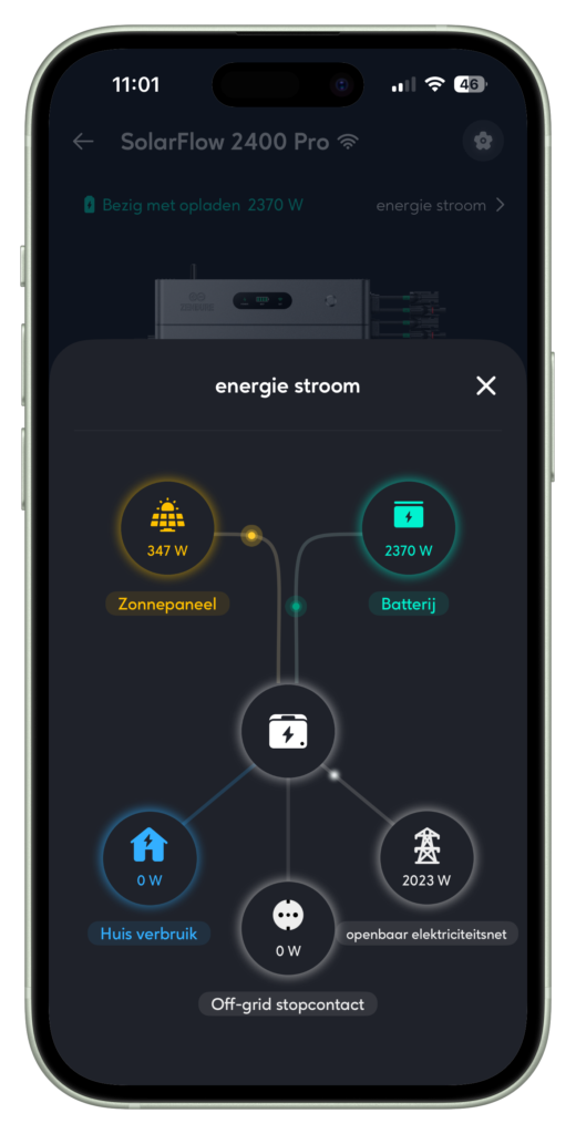 De SolarFlow 2400 Pro is een hybride‑stekkerbatterij die kan laden via het lichtnet en met de direct aangesloten zonnepanelen én uiteraard ook met het overschot van je eventuele bestaande zonnepaneleninstallatie.