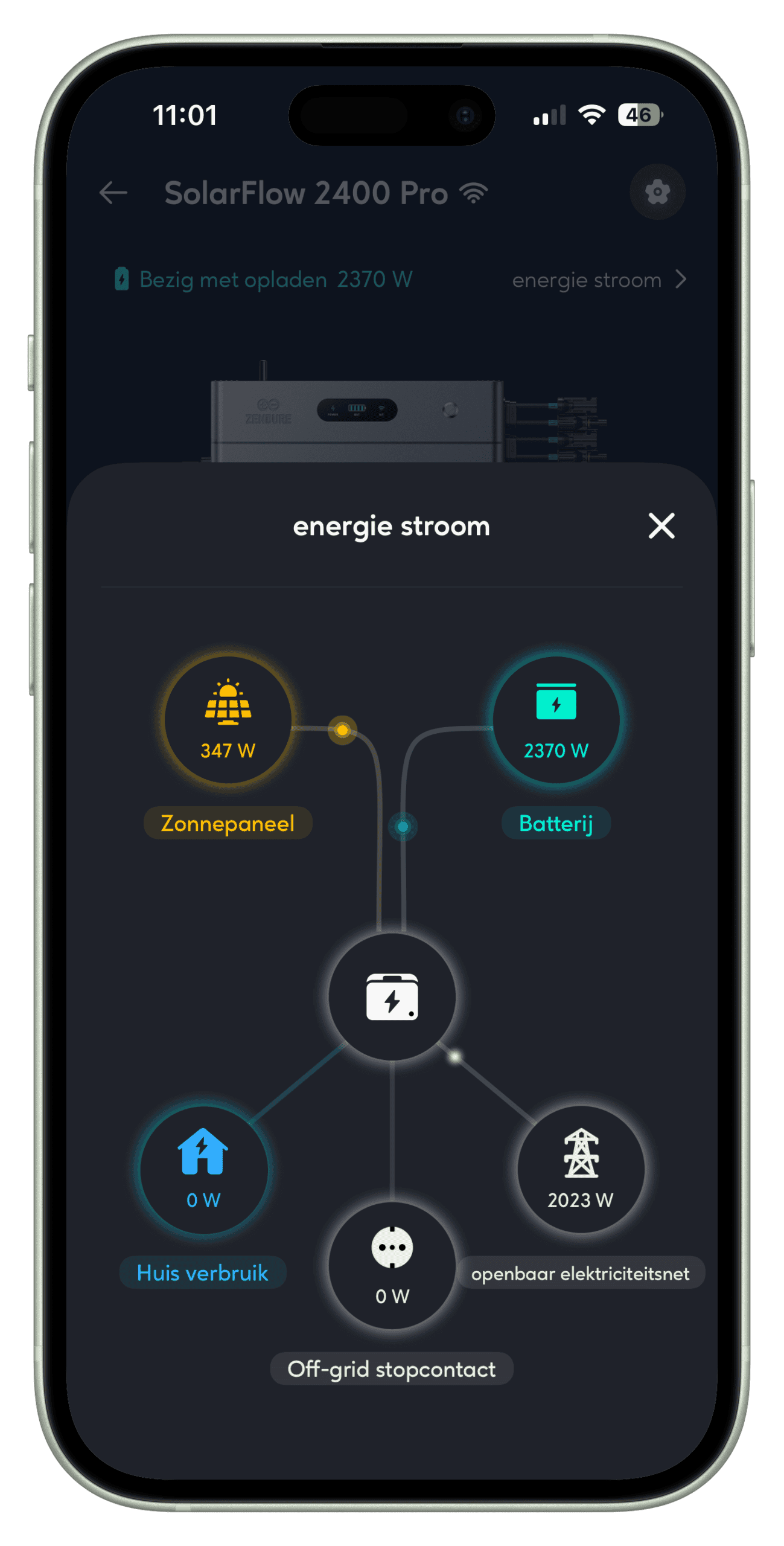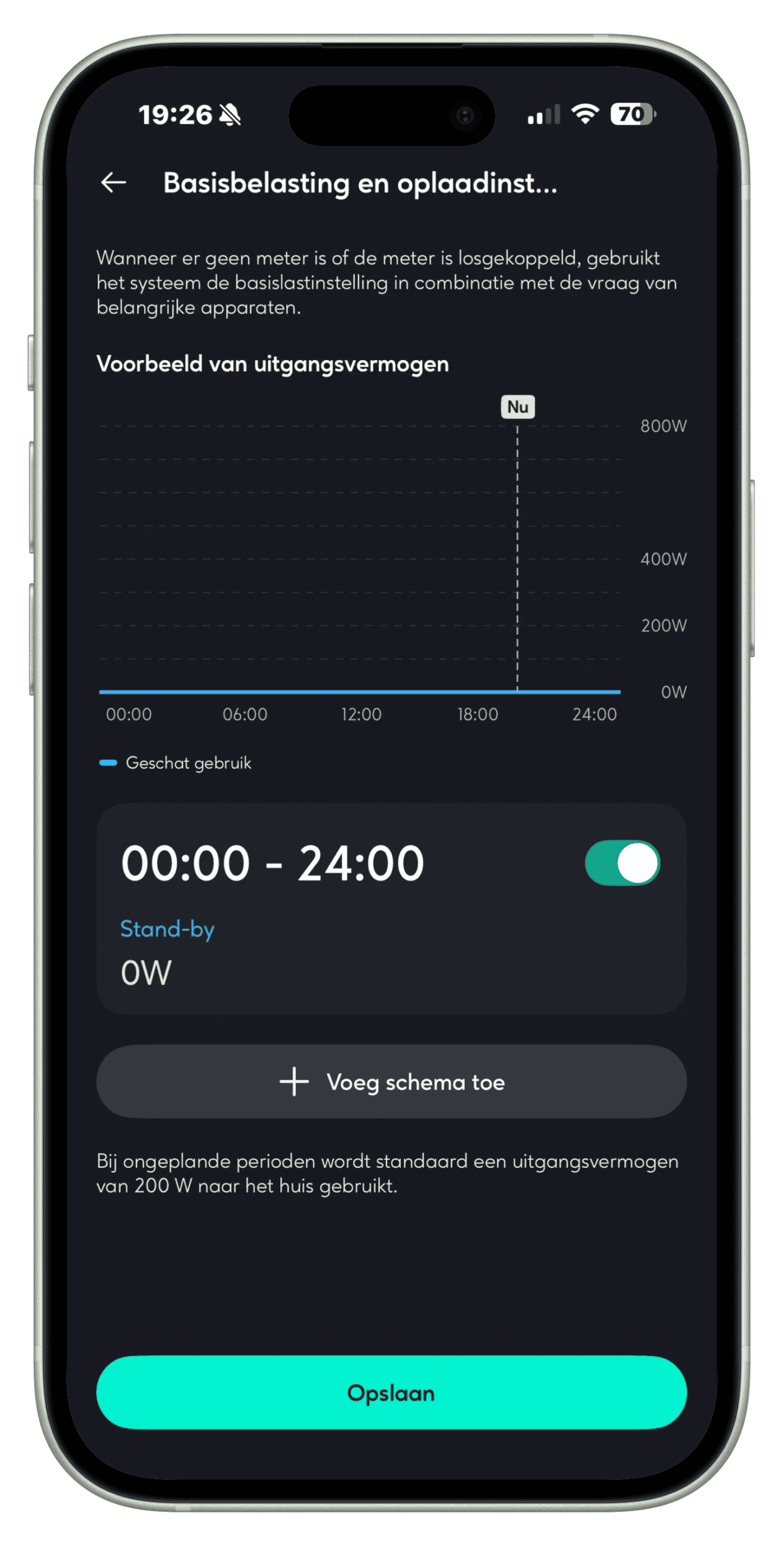- Vermogen AC‑uitgang van 0–800 W via een standaard stopcontact en tot 2400 W op een eigen groep met vaste aansluiting