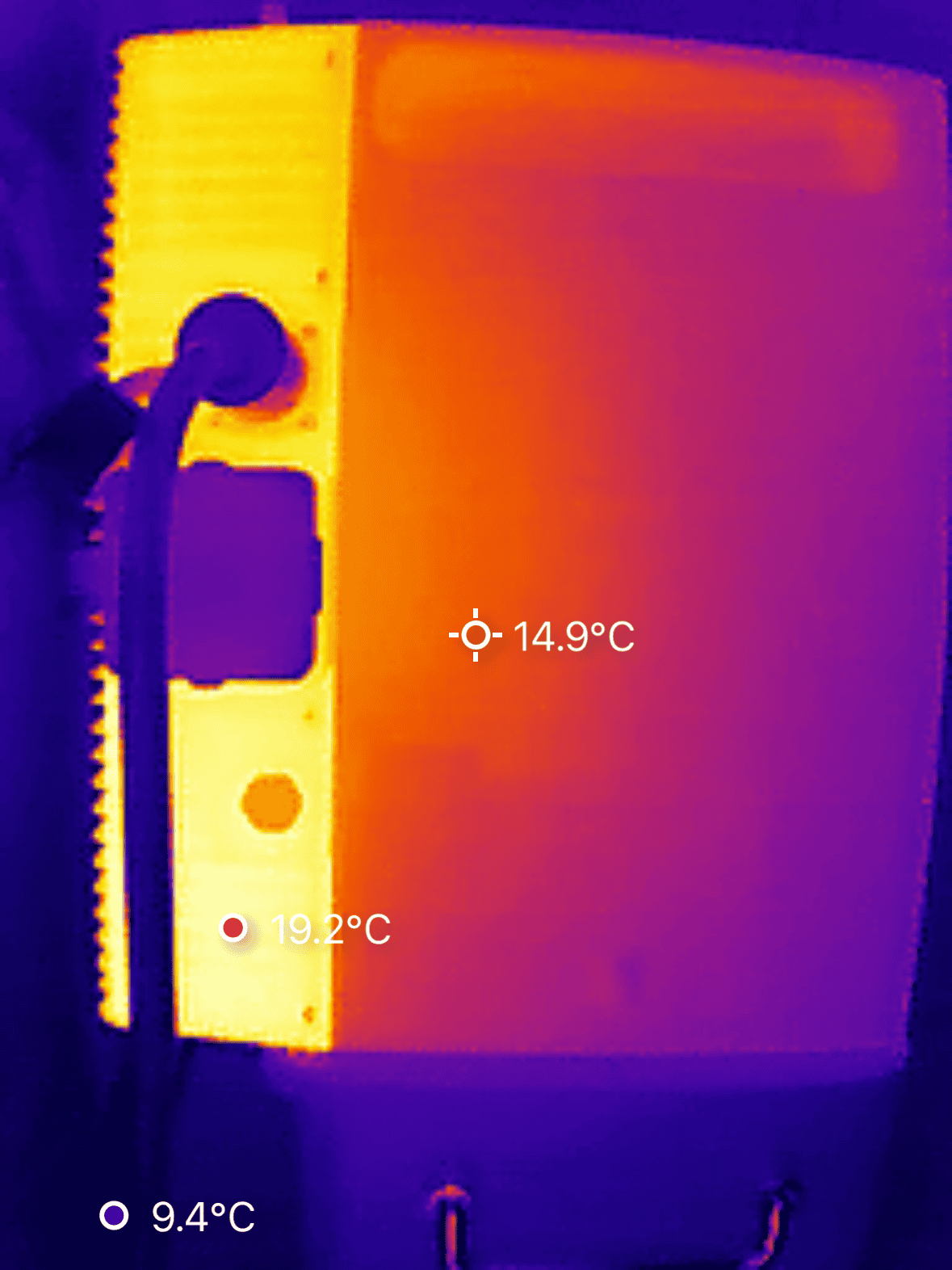 We hebben de warmteontwikkeling van de SolarFlow 2400 Pro onderzocht met behulp van een warmtebeeldcamera. De metingen zijn uitgevoerd nadat het systeem ca. twee uur lang aan het laden was met een vermogen van 800 W. De hoogste waarde werd geregistreerd aan de achterzijde van het apparaat, met een temperatuur van 24 °C. Alle overige meetpunten lagen lager.