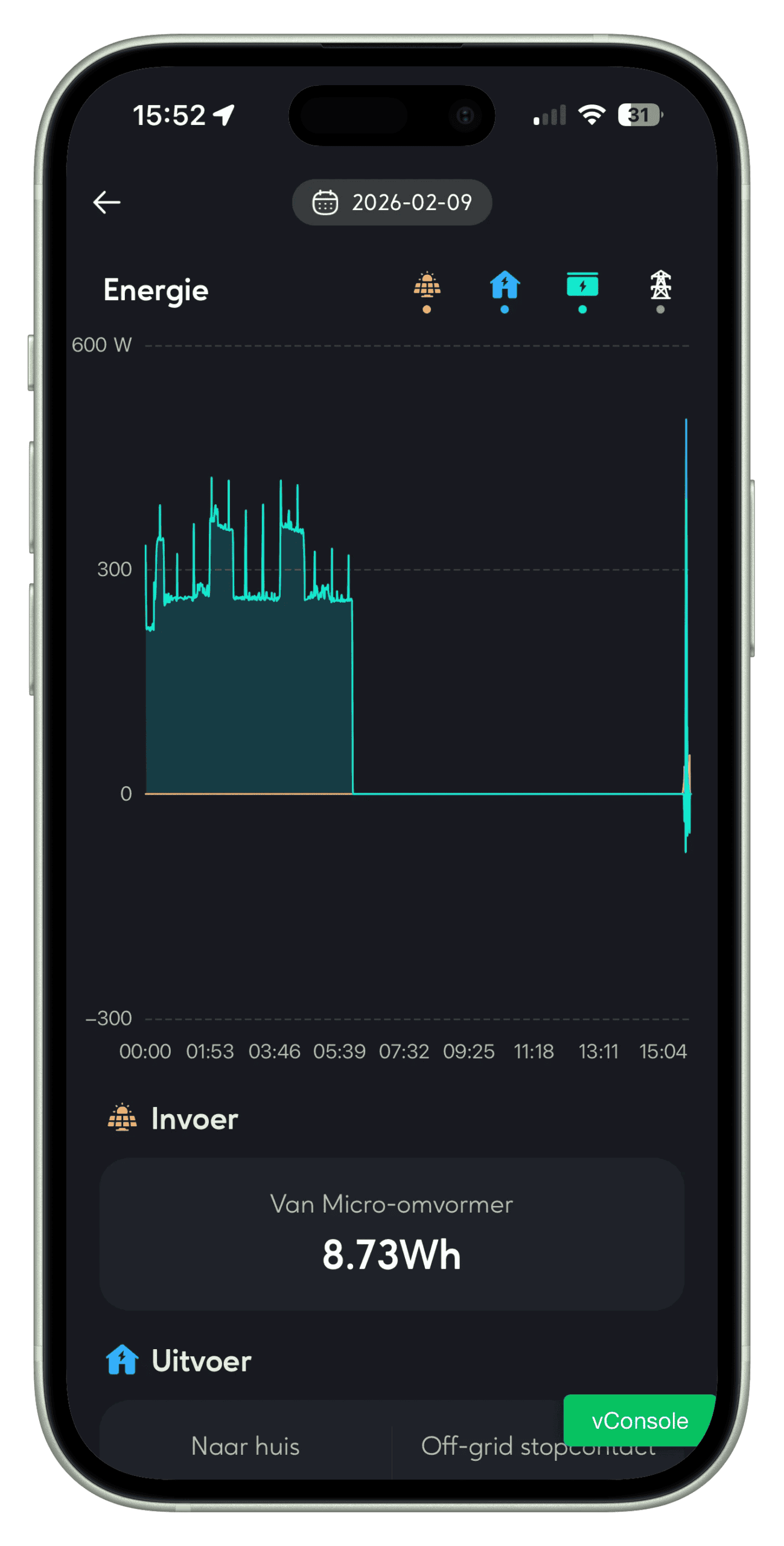 Het off-grid stopcontact ondersteunt tevens het aansluiten van zonnepanelen via een micro-omvormer. Wij hebben dit succesvol getest met onze APsystems EZ1-M en twee 440 Wp zonnepanelen. Wanneer de batterij is verbonden met het huisnet, laadt de batterij op via de micro-omvormer terwijl apparaten op ditzelfde off-grid stopcontact gelijktijdig van stroom worden voorzien. In eilandmodus is het beperkt tot enkel het aansluiten van verbruikers. Hiervoor dient in de instellingen van de batterij wel de Off-grid-modus te worden geactiveerd. Hieronder zie je de resultaten. Het is weliswaar slechts 25 W, maar dat is gemeten op een dag waarop de zonnepanelen besneeuwd waren en dus nauwelijks iets produceerden.