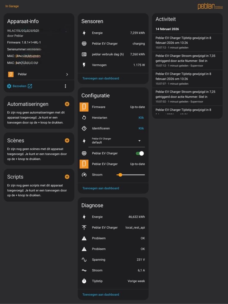 Het grootste pluspunt voor mij is de lokale API. Veel laadpalen dwingen je naar de cloud, maar de Peblar is via een lokaal IP-adres direct uit te lezen en aan te sturen zeker samen met de Homewizard P1 meter. Dit werkt razendsnel en zonder vertraging. Of je nu met Home Assistant, Homey of EVCC aan de slag gaat de Peblar laat zich moeiteloos aansturen en uitlezen.