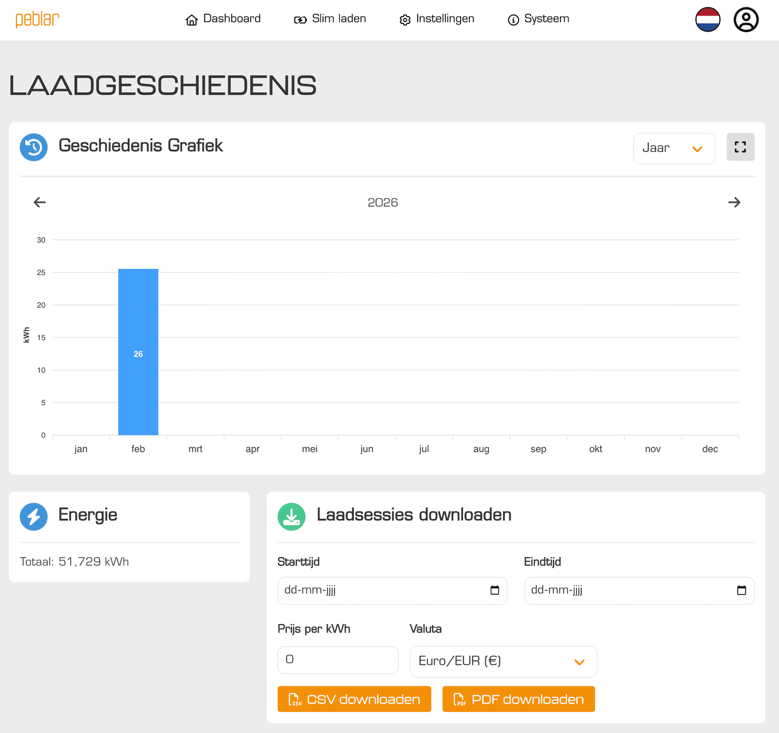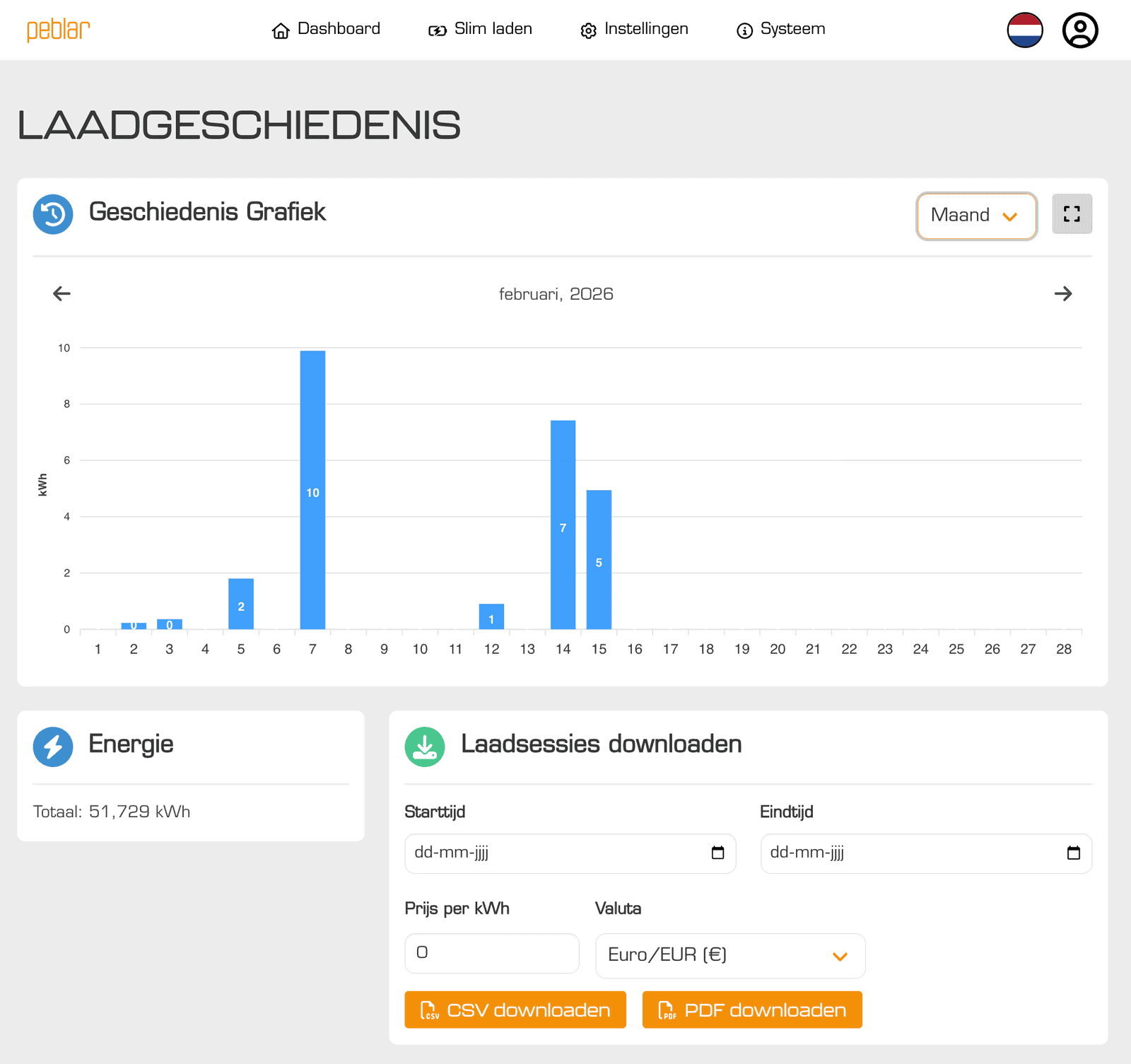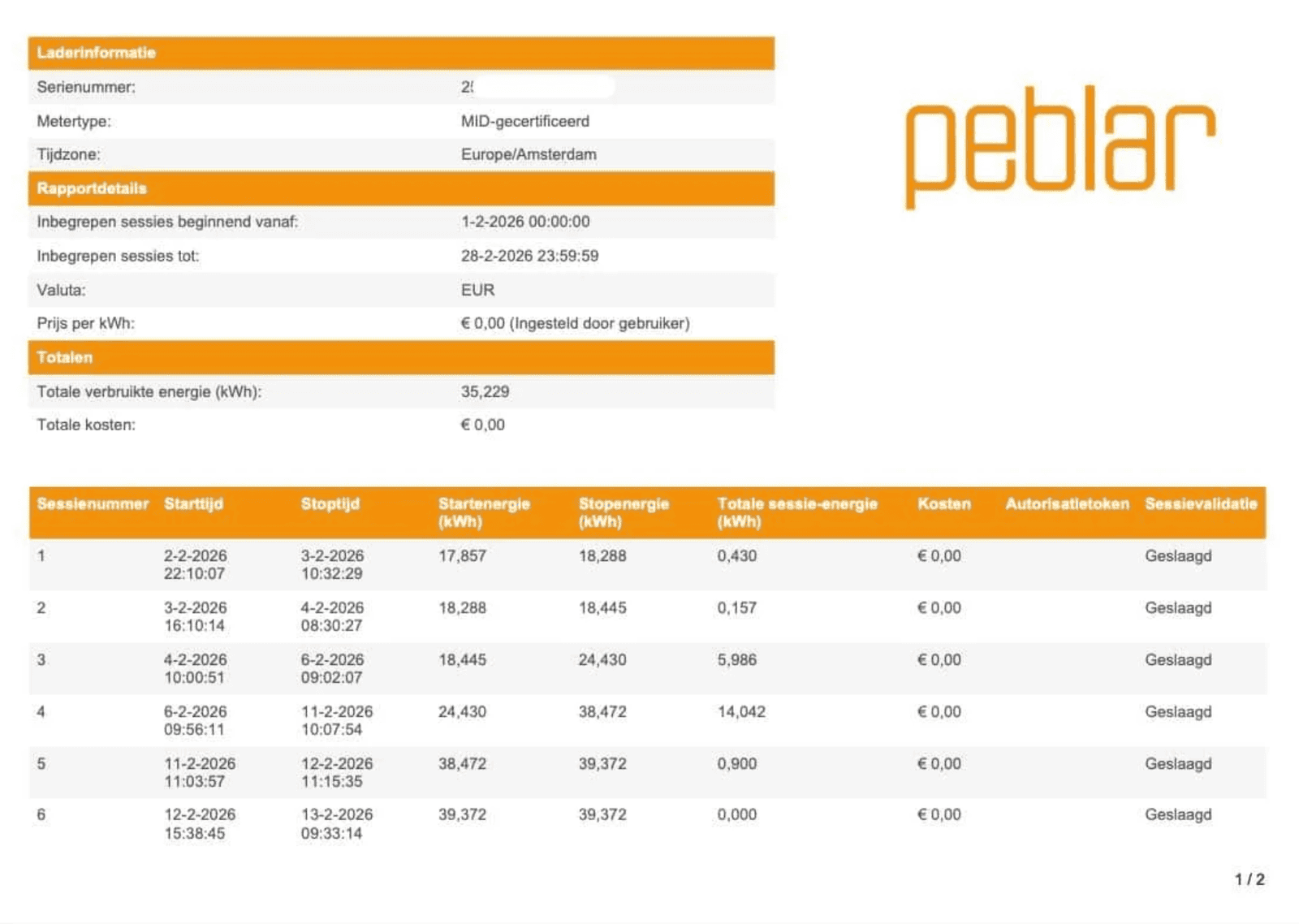 Hoewel de lader meestal thuis hangt, biedt de “Business” variant via de web-app ook ondersteuning voor OCPP (Open Charge Point Protocol). Hiermee kun je de lader koppelen aan back-offices van derden (zoals E-Flux of BlueCorner) om de stroomkosten automatisch te declareren bij een werkgever. En is de Business voorzien van een MID meter voor nauwkeurige energiemeting. Hieronder onze testsessies met de Peblar, deze rapportage kun je vanuit het dashboard aanmaken en downloaden als PDF of CSV bestand voor de ERE-registratie of andere verrekening.